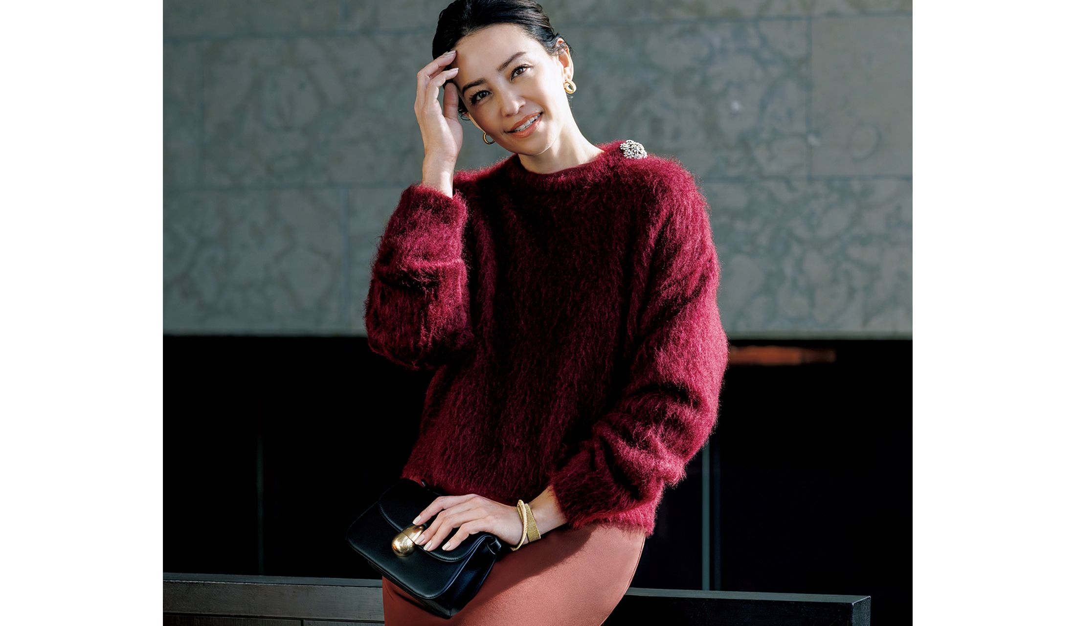 艶めくシルクドレスに、ふんわりと起毛したモヘアニットをレイヤード。異素材を重ねることで奥行きとこなれ感が生まれ、ジューシーな赤にさらなる趣を宿す。肩に施されたビジューが特別感を高めて。
