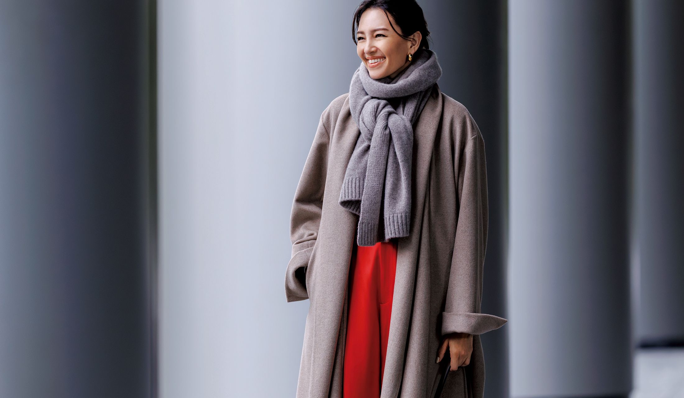 とろみと落ち感の美しい赤のシルクパンツを主役に、温もり溢れるウォームカラーでまとめたコートスタイル。分量のあるロングコートで配色バランスを調整することで、鮮烈な赤パンツの迫力が和らぎ、エレガントな佇まいに。