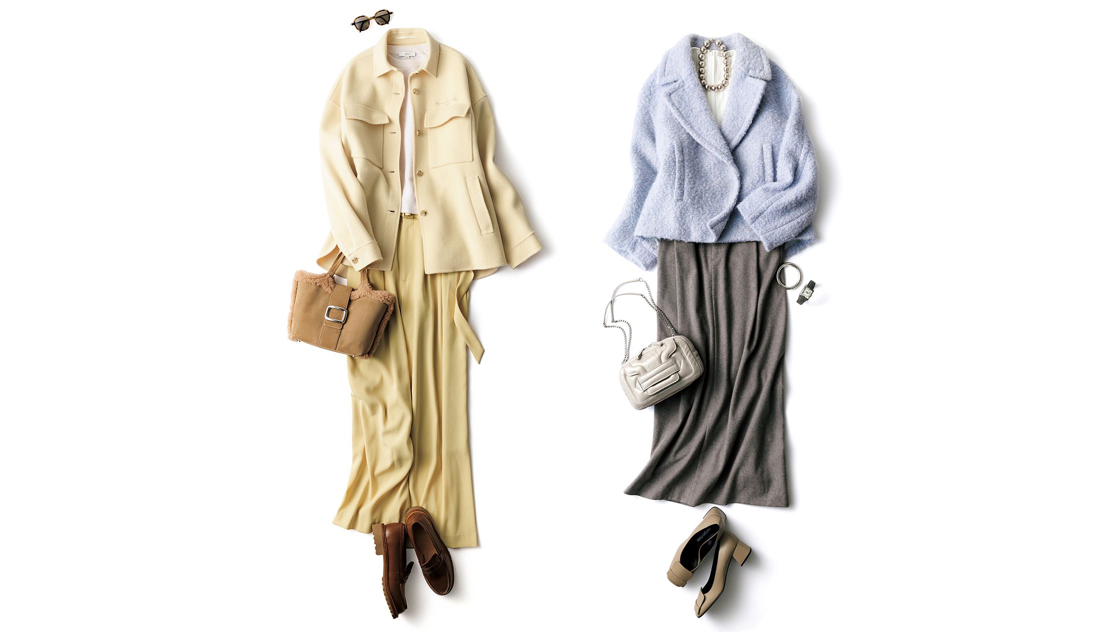 濃淡のあるイエローを掛け合わせた洗練ワントーン。ワークテイストのウールジャケットやワイドパンツなど、カジュアルなアイテムを選ぶことで、きれい色でまとめても親しみやすいイメージに着地する。