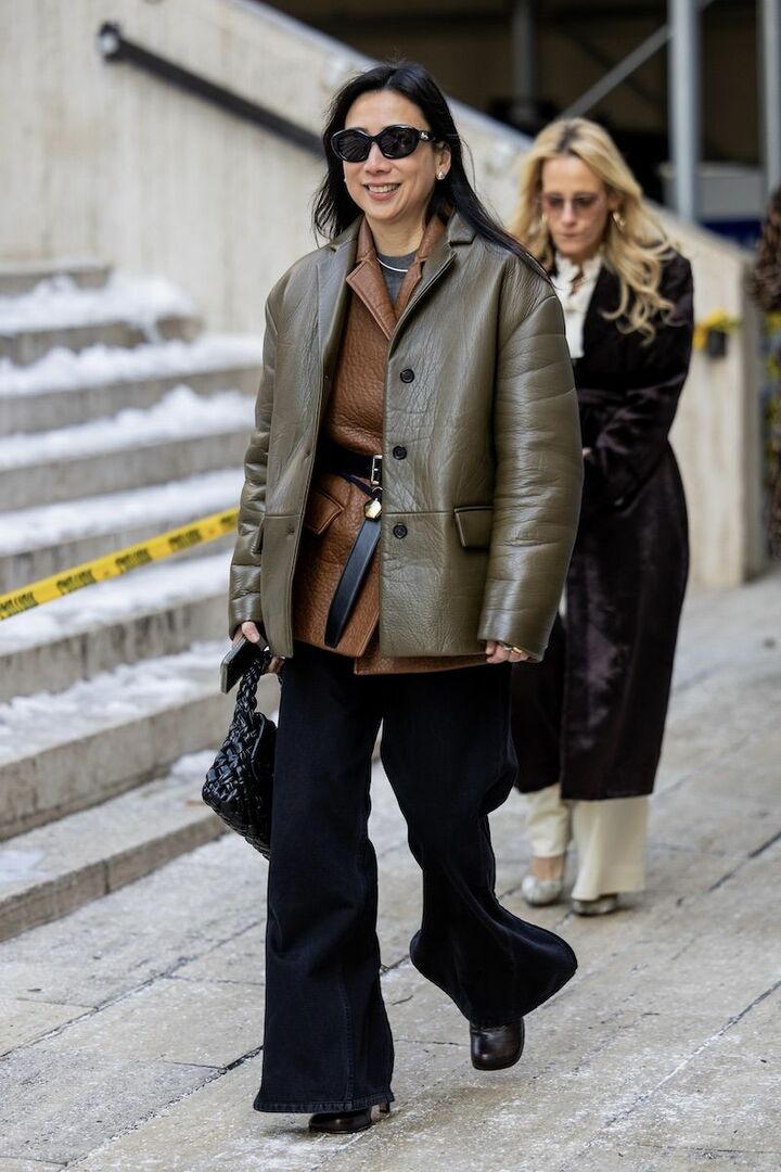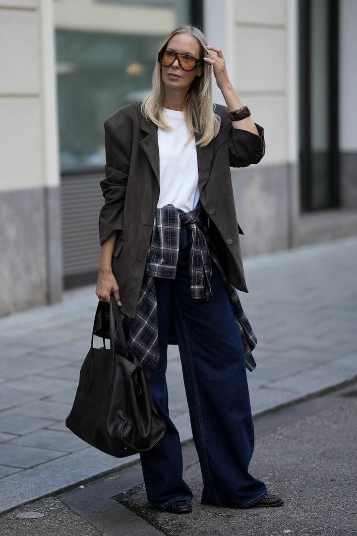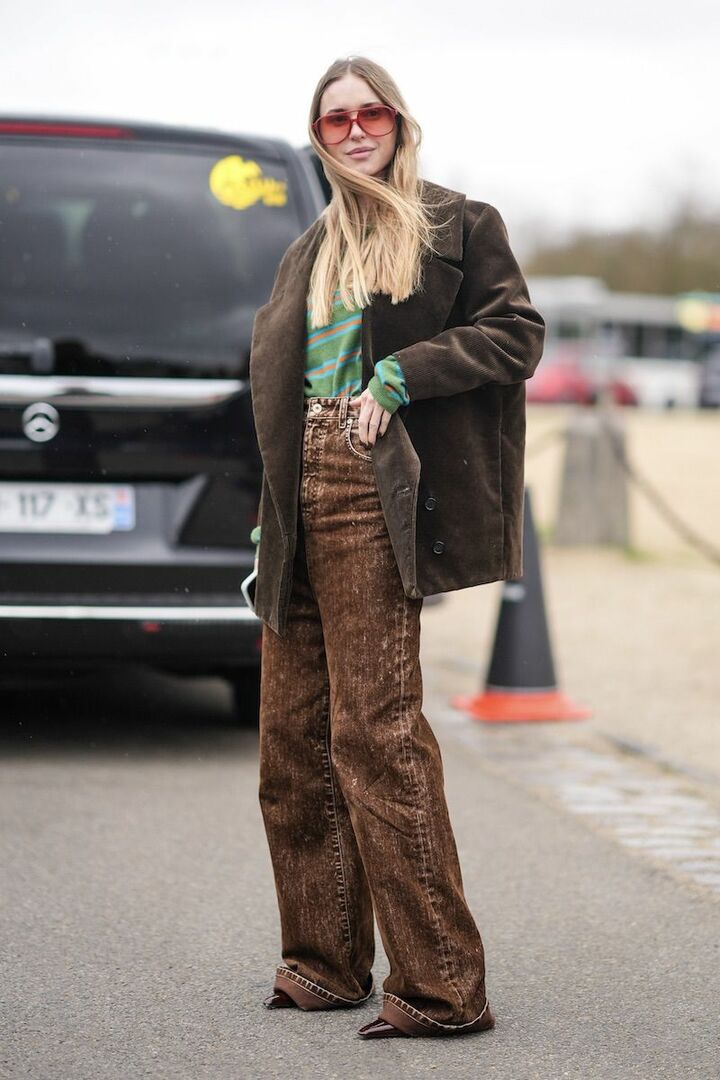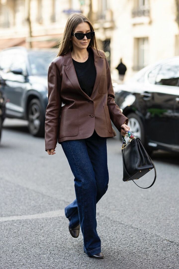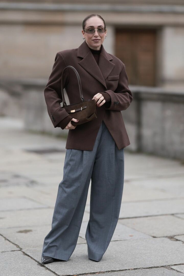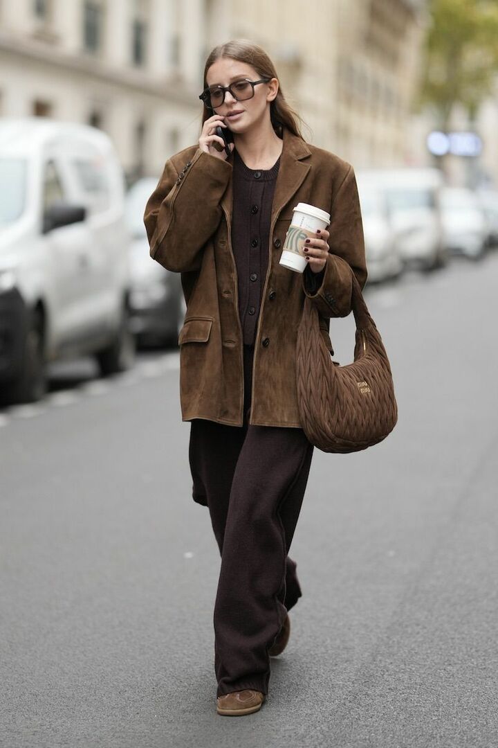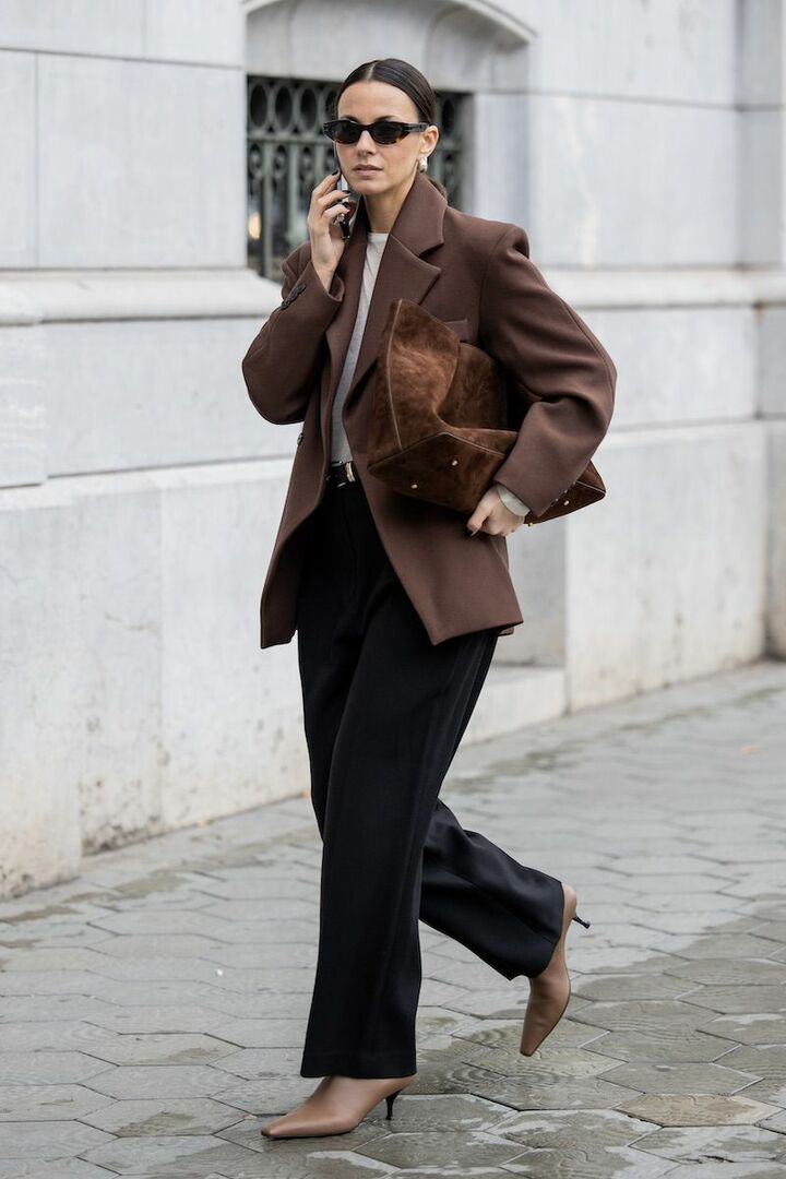 ブラウンのジャケットと小物、黒パンツのベーシックコーディネートがあか抜けて見える理由は、シルエットと素材選びにあり。ゆったりとした形でエフォートレスに導きながら、重厚感のあるスエードバッグとつんと尖ったブーツでコントラストを描くと好バランス。