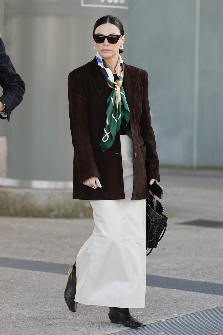 黒のような意志がありながら、優しさも備えたビターブラウンのスエードジャケットを迎え、たおやかに。ロング丈のジャケットだから、ボトムはすらりとした白スカートを選ぶのが吉。柔らかく落ち、揺れが美しいグリーンスカーフが優雅さを助長。