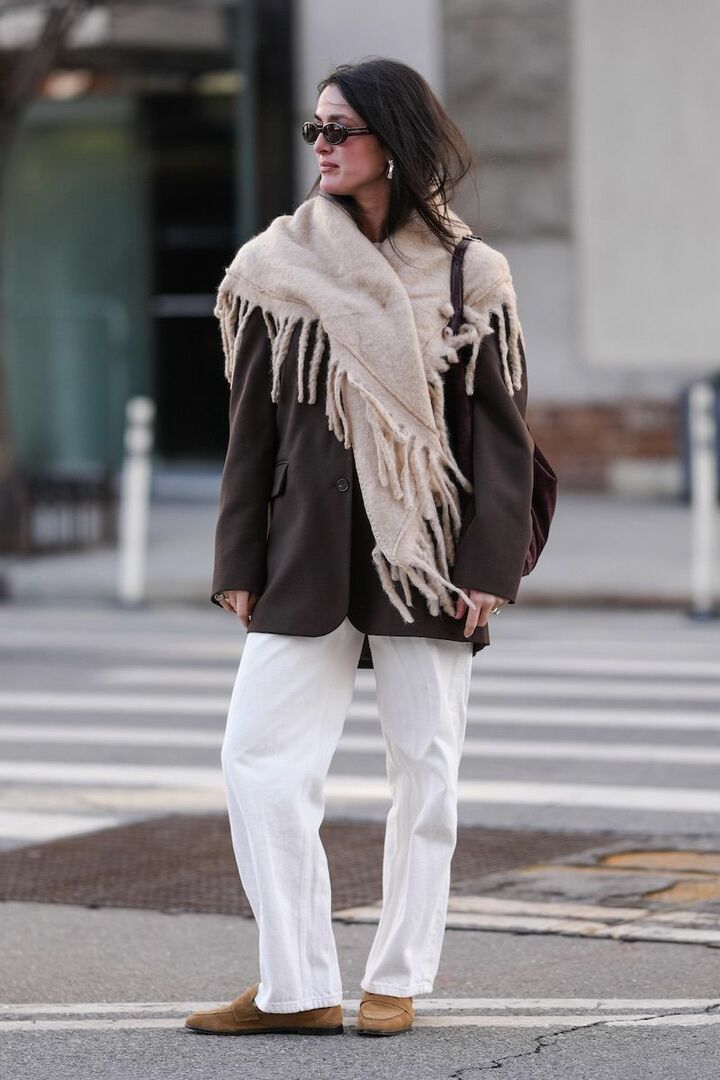 ビターなブラウンジャケットに、白のデニムパンツとライトベージュのニットスカーフを足し、柔和なオーラを放って。スエード素材の小物が異なる質感同士をやさしく繋いでくれるから、奥行きのあるコーディネートが完成。