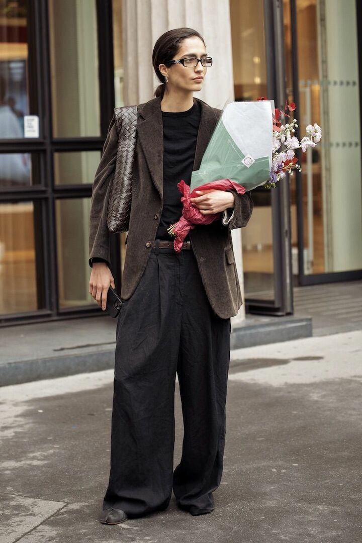 パワーショルダー、くびれたウエストという構築的なディテールで、ブラウンジャケットをモードに昇華。よそ行き感の強いジャケットだからこそ、ボトムはミニマルでありながら、程よい抜け感を叶えてくれる黒のスリットパンツをチョイス。小物もシンプルな黒を選ぶと好バランス。