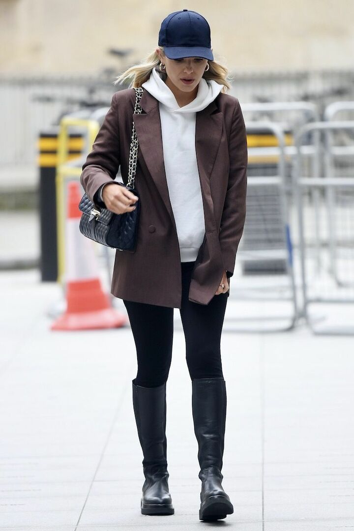 白のパーカと黒のレギンス、ブーツとバッグでコーディネートし、明確なカラーコントラストを授けたモリー・キング。中間色であるブラウンのジャケットとネイビーキャップをプラスし、上品さを両立できる大人アクティブスタイルへと昇華。ジャケットは、ヒップを覆う丈感が安心。