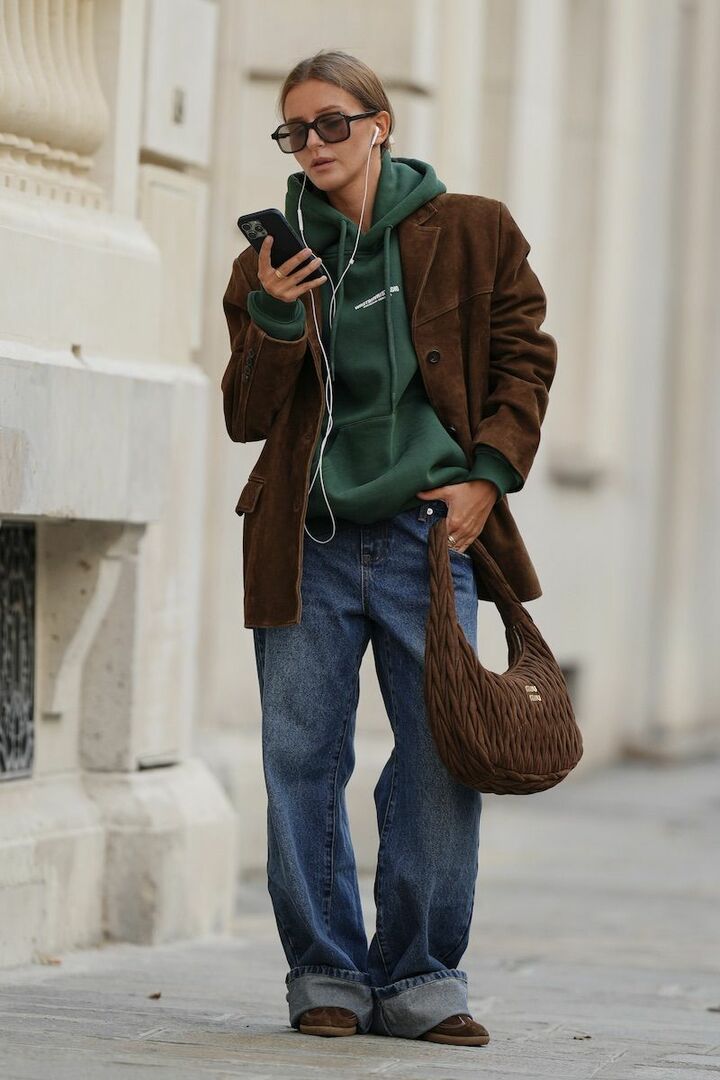 リラックス感の強いパーカとデニムパンツのワンツーは、深緑や濃いブルーの色合わせで程よく引き締め。深みのあるブラウン、スエード素材のジャケットと小物をプラスして、程よいクラスアップを実行。