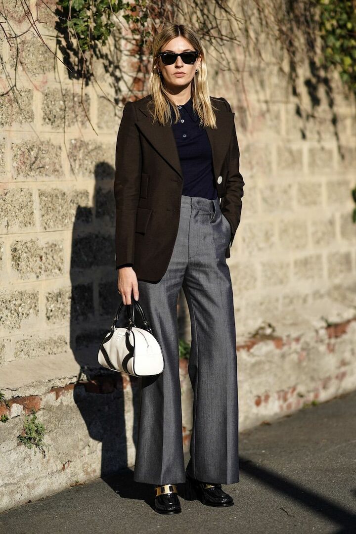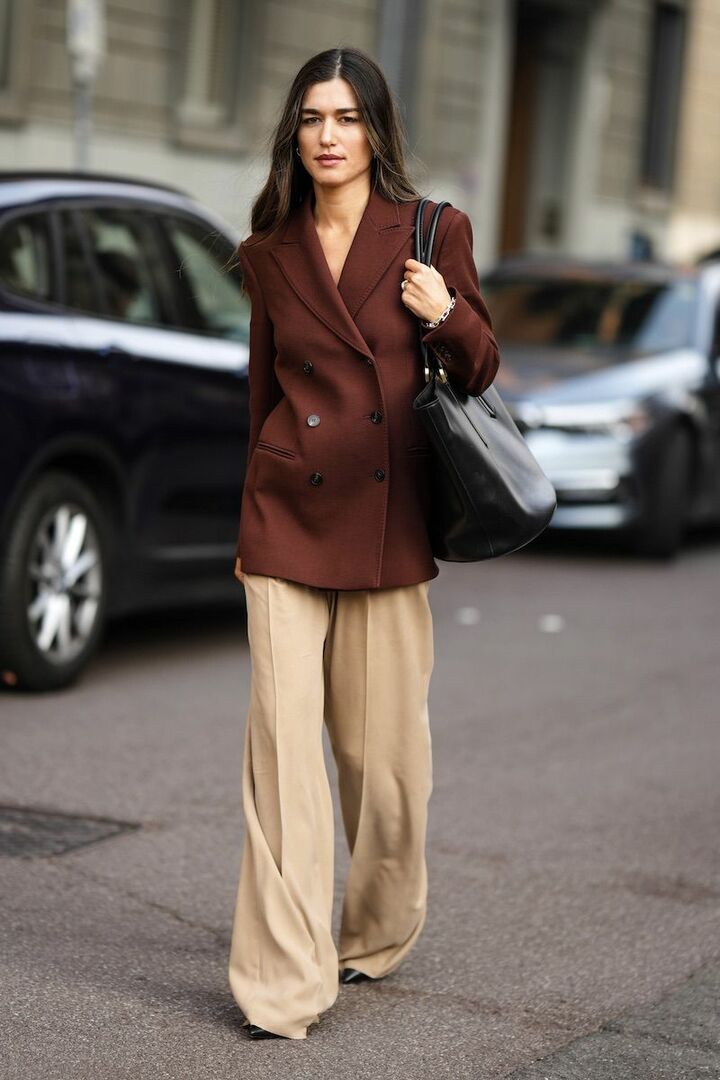 ブラウンジャケットとベージュパンツ。シンプルに徹すれば、かえって絵になるスタイルに。わずかに余白のあるダブルブレストジャケット、しなやかなワイドフレアパンツのように、形にはこだわりこなれた気配を忍ばせて。