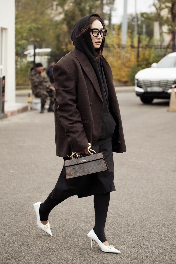 パワーショルダージャケットやスカートとレギンスのレイヤード、モダンな形の小物でつくるモードコーディネートは、親近感のあるパーカをミックスするだけで程よく力が抜け、こなれ感が漂います。ダークカラーを基調としているから、足元の白が一層引き立って軽やかに着地。