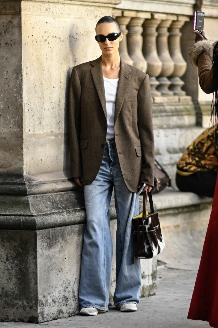 白カットソーとブルーデニムパンツ、スニーカーの定番カジュアルスタイルは、ブラウンジャケットを重ねるだけでたちまちこなれた印象に。カジュアルに見合うよう、オーバーシルエットのジャケットを選ぶのが吉。スリークなまとめ髪も着映えに貢献。