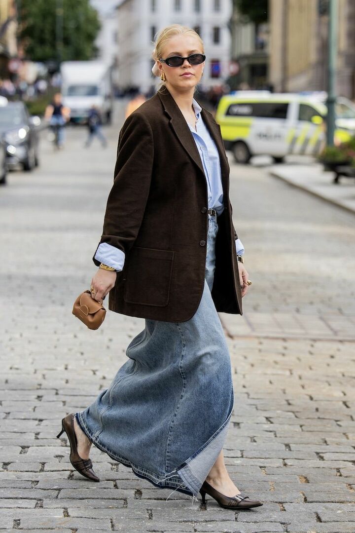 水色シャツとブルーのデニムスカートを合わせてクリーンさを演出。ビターなブラウンのジャケットで優しく引き締めれば、黒ほどコントラストがつかず、ちょうどいいバランスに着地。ゆったりジャケット×マキシスカートの装いなので、小物はコンパクトなシルエットをセレクト。