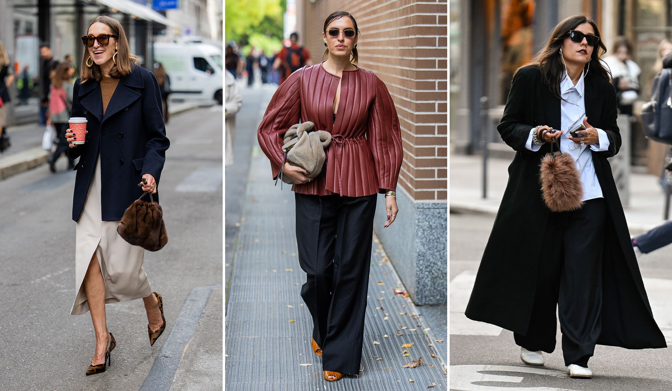 まずは元ファッション誌編集長でインフルエンサーのアネット・ウェーバーが、2025年9月下旬、ミラノでキャッチされたときの着こなしです。キャメルのニットにベージュのスカート、アウターにネイビーのPコートを愛用していました。色味も落ち着きがあってアイテム自体もコンサバな装いにレザーのハンドバッグを投入すると、ちょっと堅いイメージになりすぎ。彼女がセレクトした巾着タイプのファーのバッグなら、ふんわりした風合いとフェミニンさが漂って大正解です。