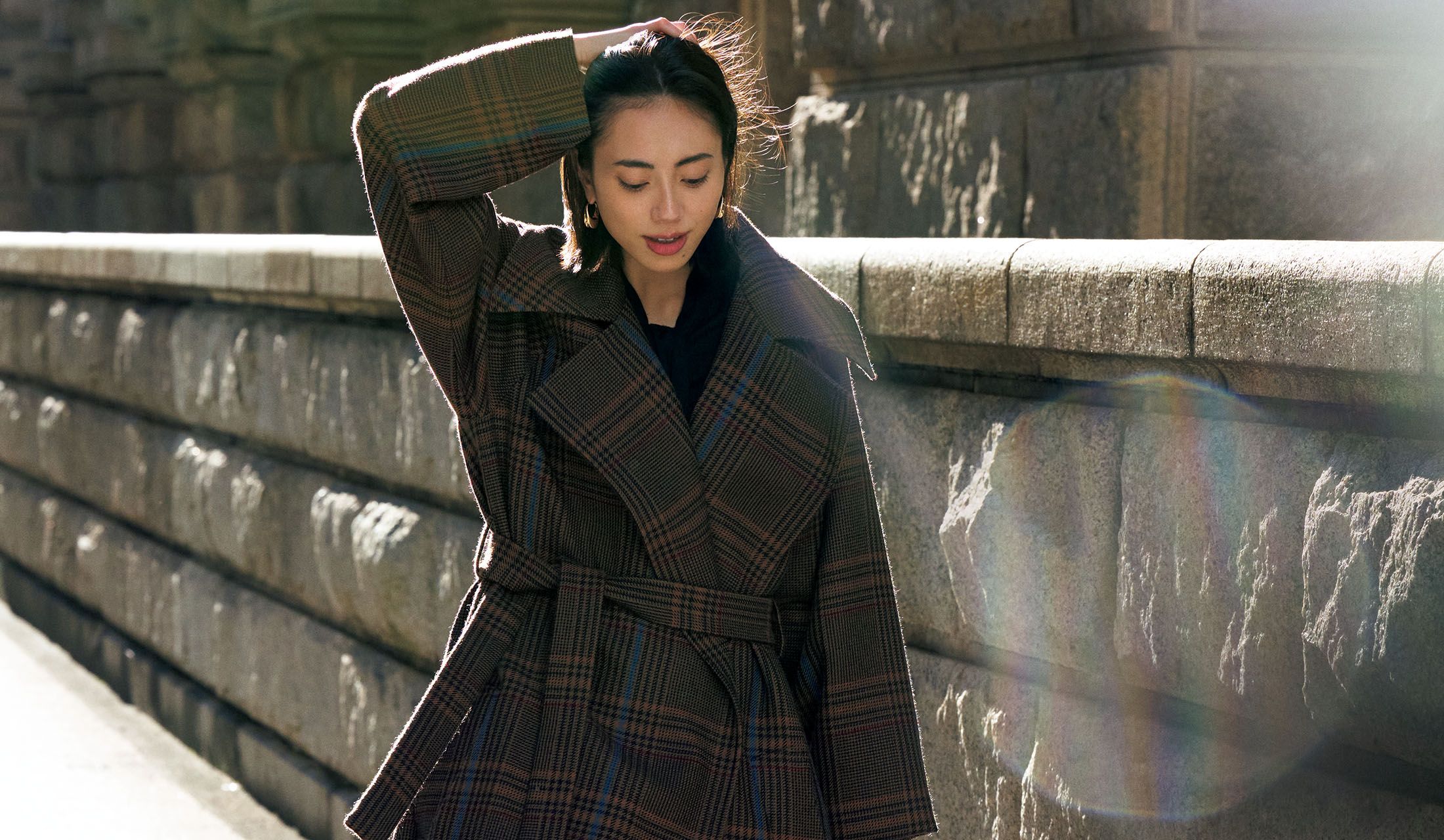 ローブのようにしなやかなシルエットにオーセンティックな柄を組み合わせたウールコートを主役に。英国調のプリンス・オブ・ウエールズ柄のコートは、マロンカラーをベースにライトブルーやレッド、イエローのラインが交差し、チアフルな雰囲気も。