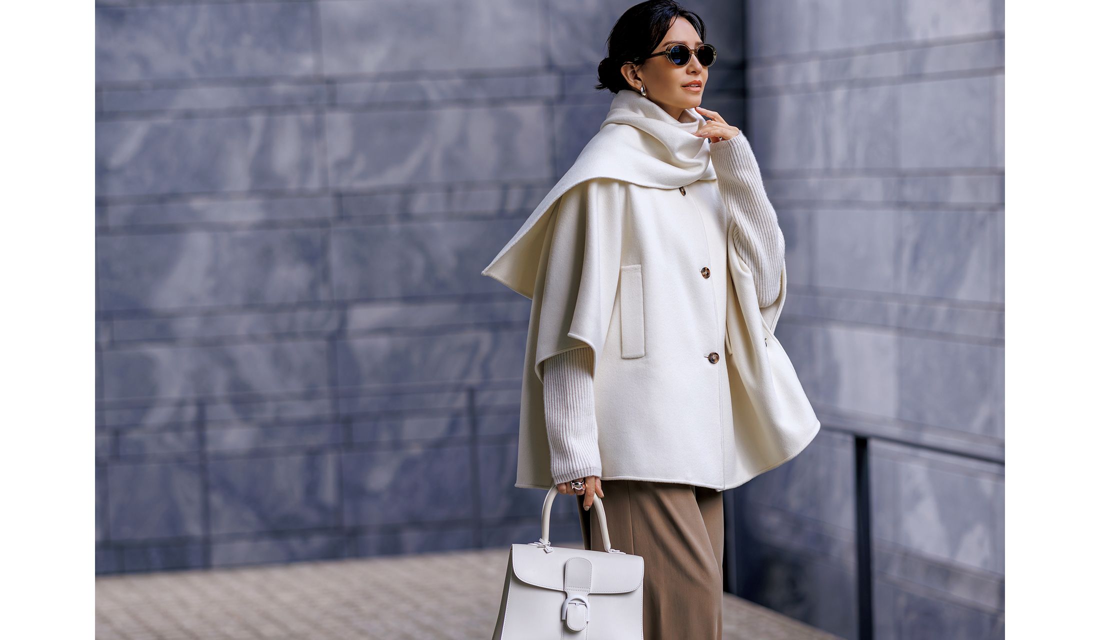 White × Dark Greige|ドレープ感が美しい淡色ポンチョが、所作をドラマティックに演出