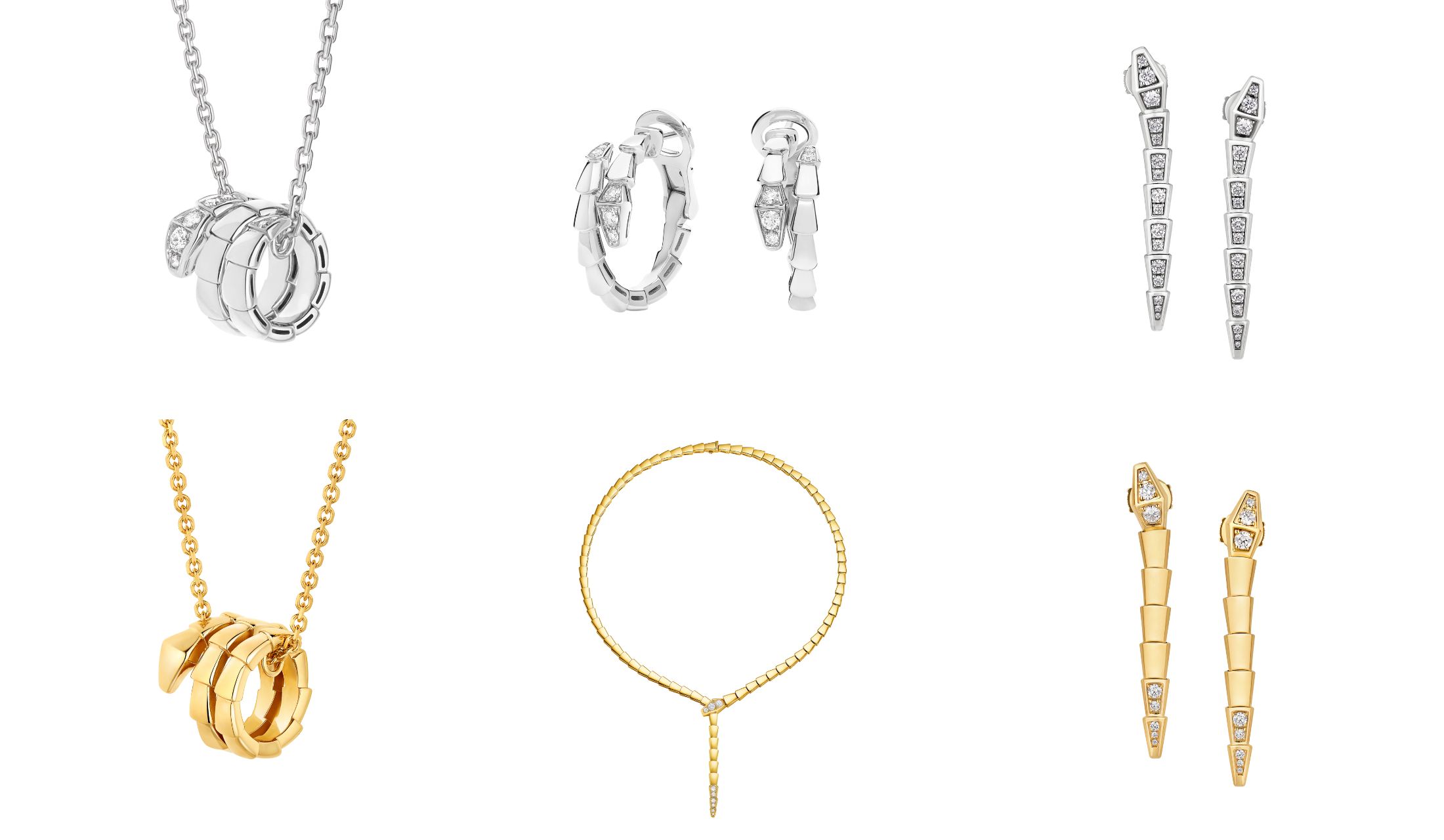 ブランドの歴史とともに進化してきたイエローゴールドは、温かみのある輝きと現代的な美しさが魅力。ミニチュアの蛇が絡みつくペンダントや、幾何学的な曲線で蛇の動きを表現したネックレス、リズミカルに揺れるドロップピアスが洗練された存在感を放ちます。