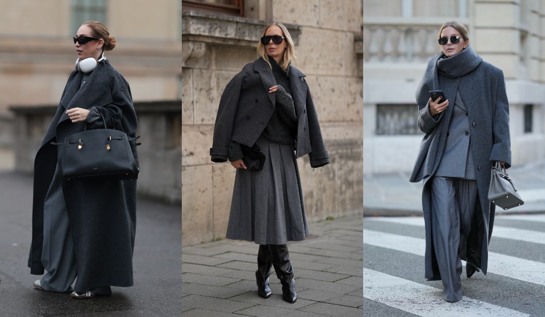 インフルエンサーのダイアン・バトゥキナをパリでスナップ。知的なグレーのスーツに、それよりも濃い色味のウールコートを重ねた装いは、主張こそ控えめながらも確かな存在感。ダブルブレストジャケットのトラッドな趣と、共布ストールが生む立体感によって、ワンカラーでも表情は豊か。仕上げにグレージュのレザーバッグを添え、異なるトーンで魅せるグレーコーディネートを完成させました。
