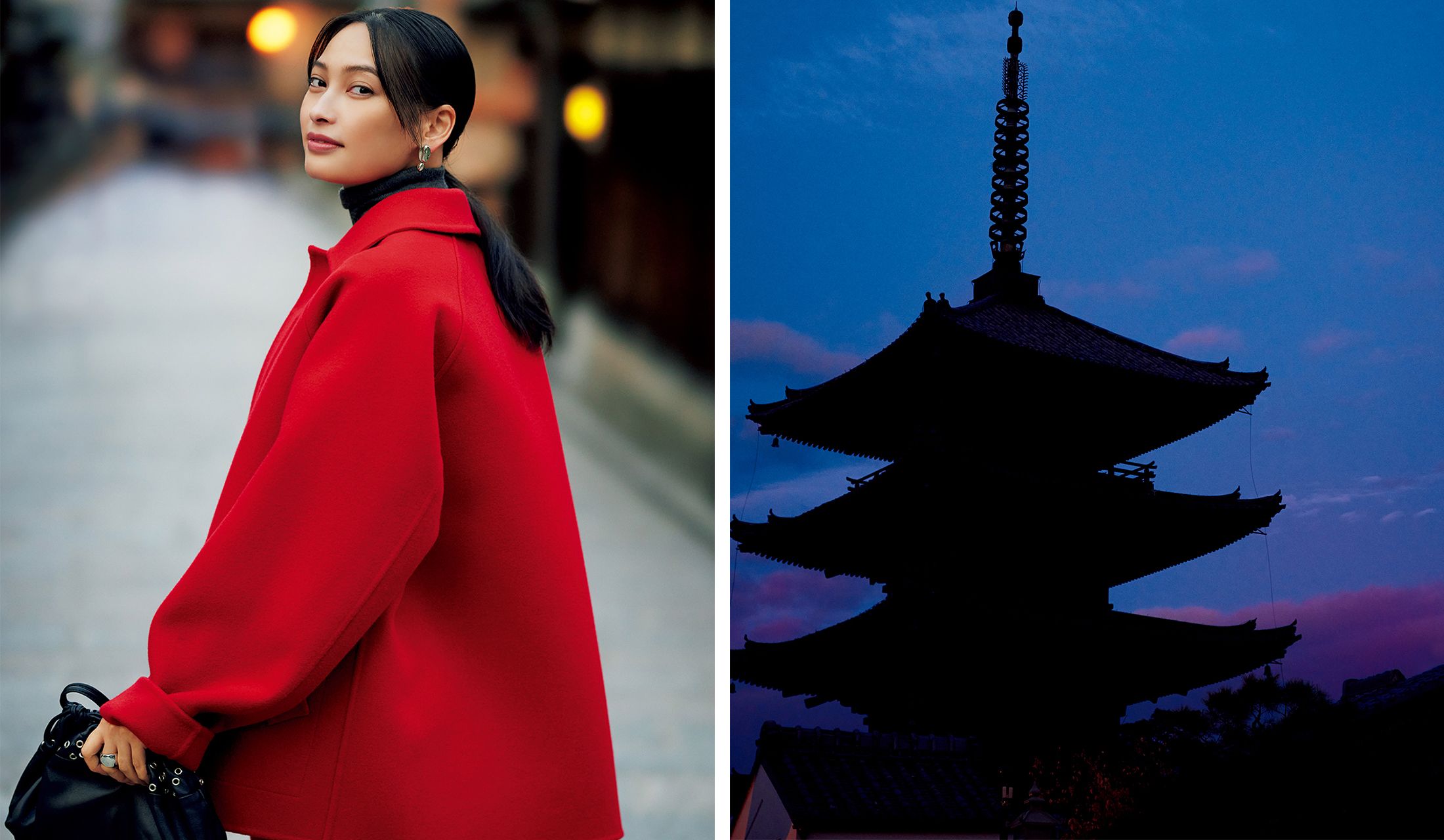 今回は、大政 絢さんがまとう、冬の京都に映えるセットアップの装いをご紹介します。