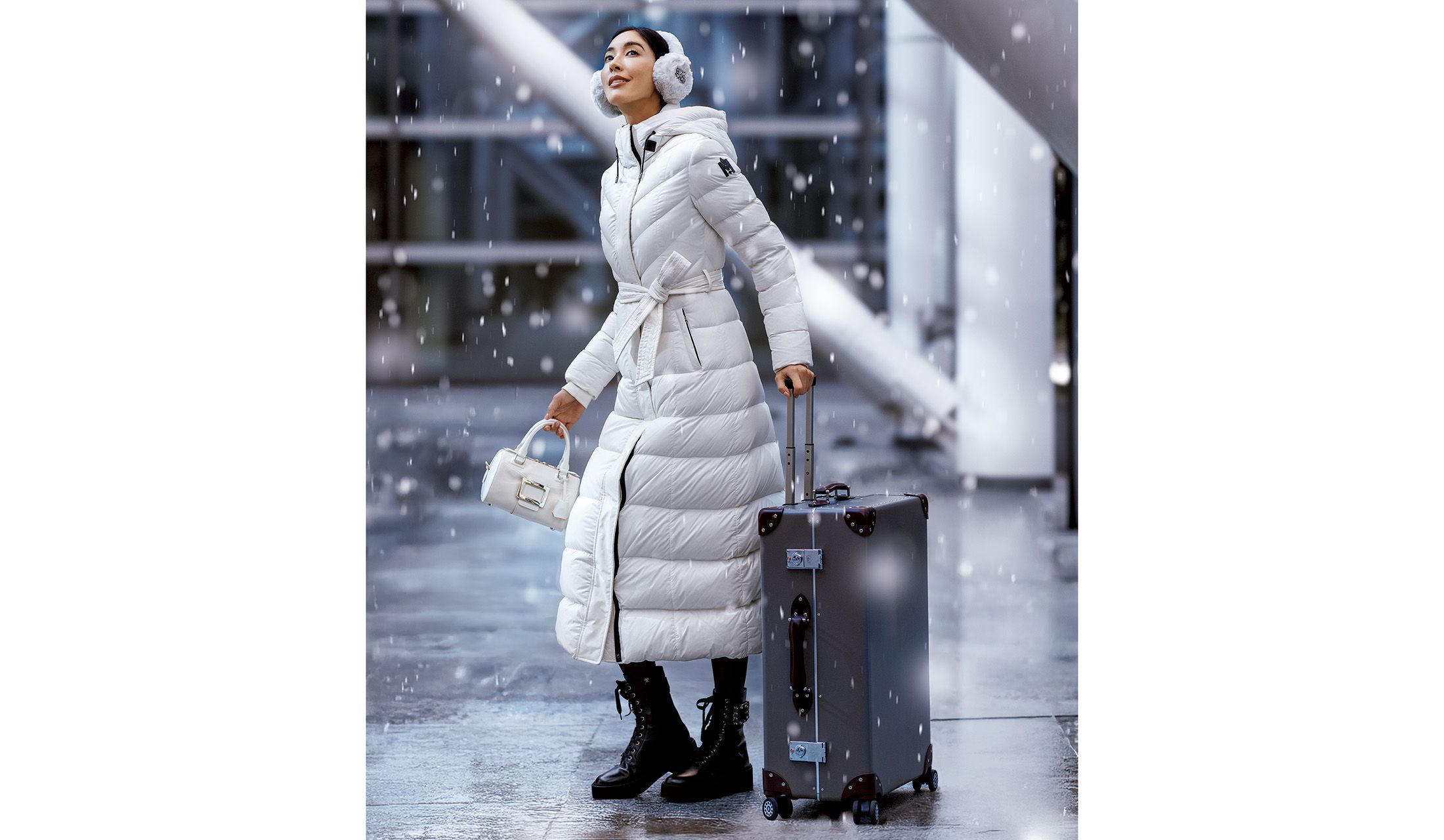 極寒の都市型ステイや、ヨーロッパの高級スノーリゾートへは、十分なフィリングを保ちながら、撥水性と通気性を備えた、軽量で細長シルエットのマキシダウンコートで。白のAラインが、気品溢れるエレガントな冬旅スタイルを叶えてくれる。