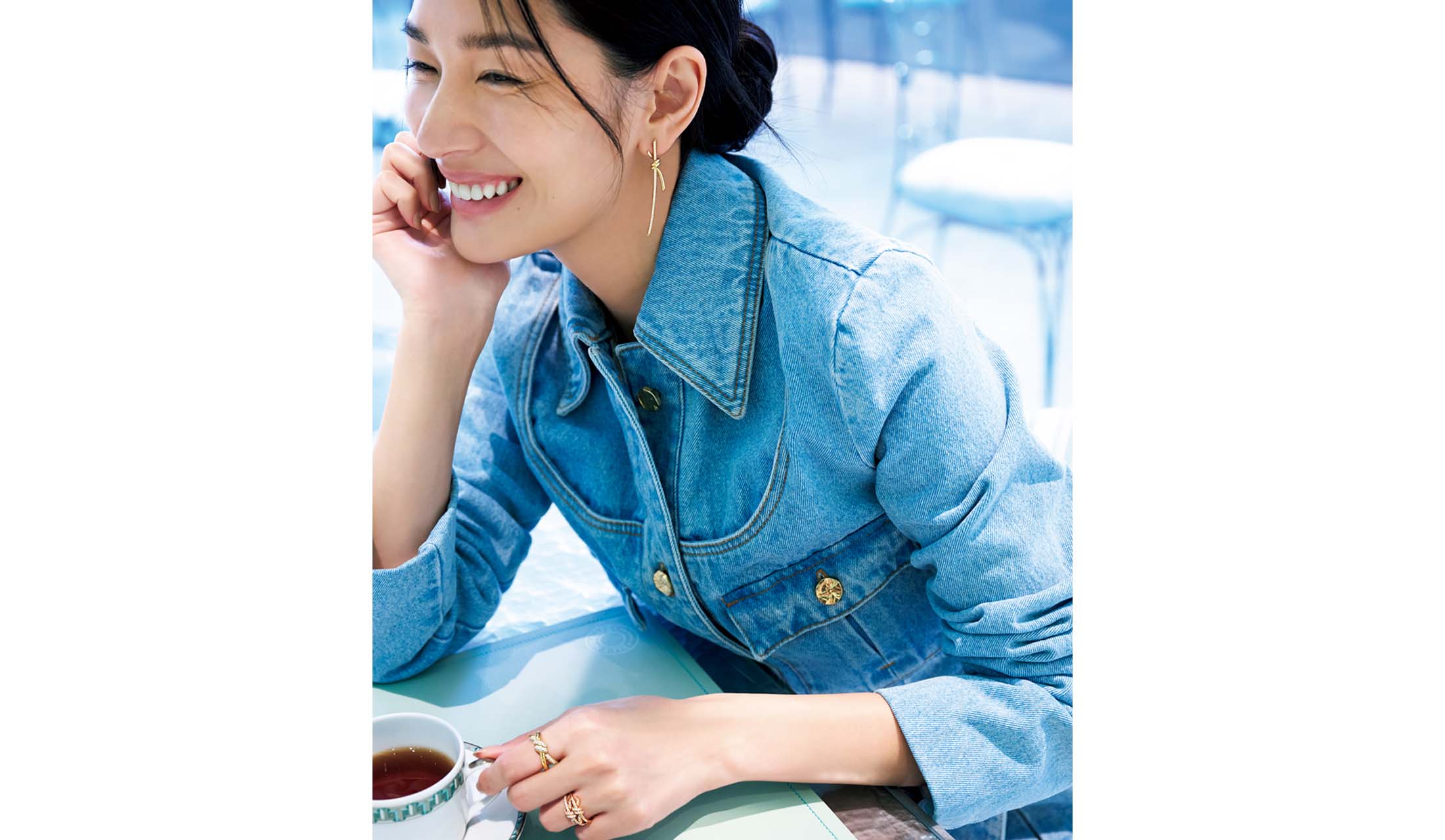 会話に花が咲く親友とのカフェタイム。「ティファニー 銀座」4階の「ブルー ボックス カフェ」に誘って、特別なひとときを満喫。かけがえのない “絆” を象徴する、リボンの結び目から着想されたピアスが、笑顔をいっそう輝かせる。
