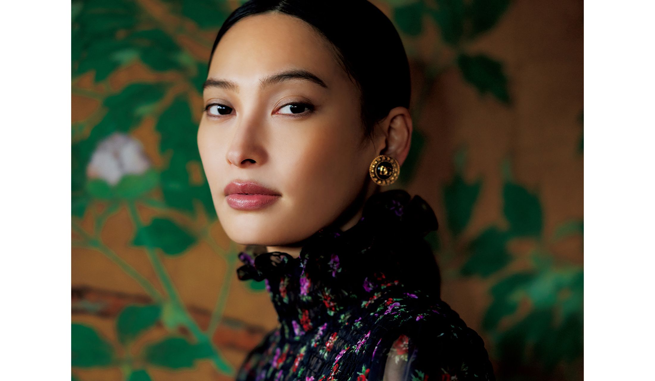 赤や紫の花が咲き誇る黒ワンピースの耳元には、クラシカルモダンなゴールドカラーのイヤリング。好奇心に導かれながら旅の特別な時間を過ごすとき、ちょっとしたおしゃれの冒険も楽しみたい。