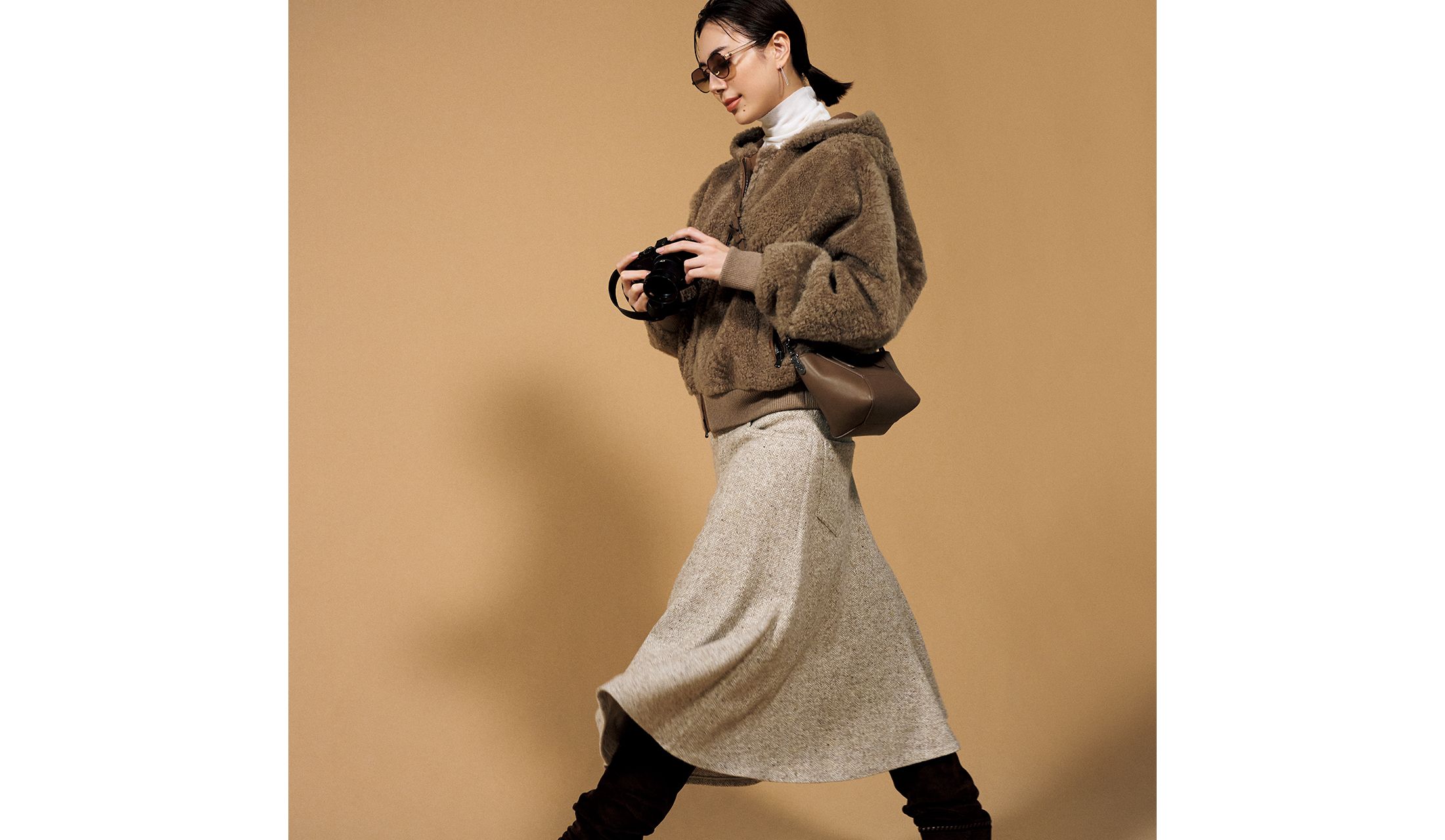 適度なボリュームが、裾の広がりを優雅に見せるウールシルクのフレアスカート。クラシックなヘリンボーン地に、5ポケットをあしらった都会的なテイストが加味され、暖かなカジュアルムートンとも好相性。