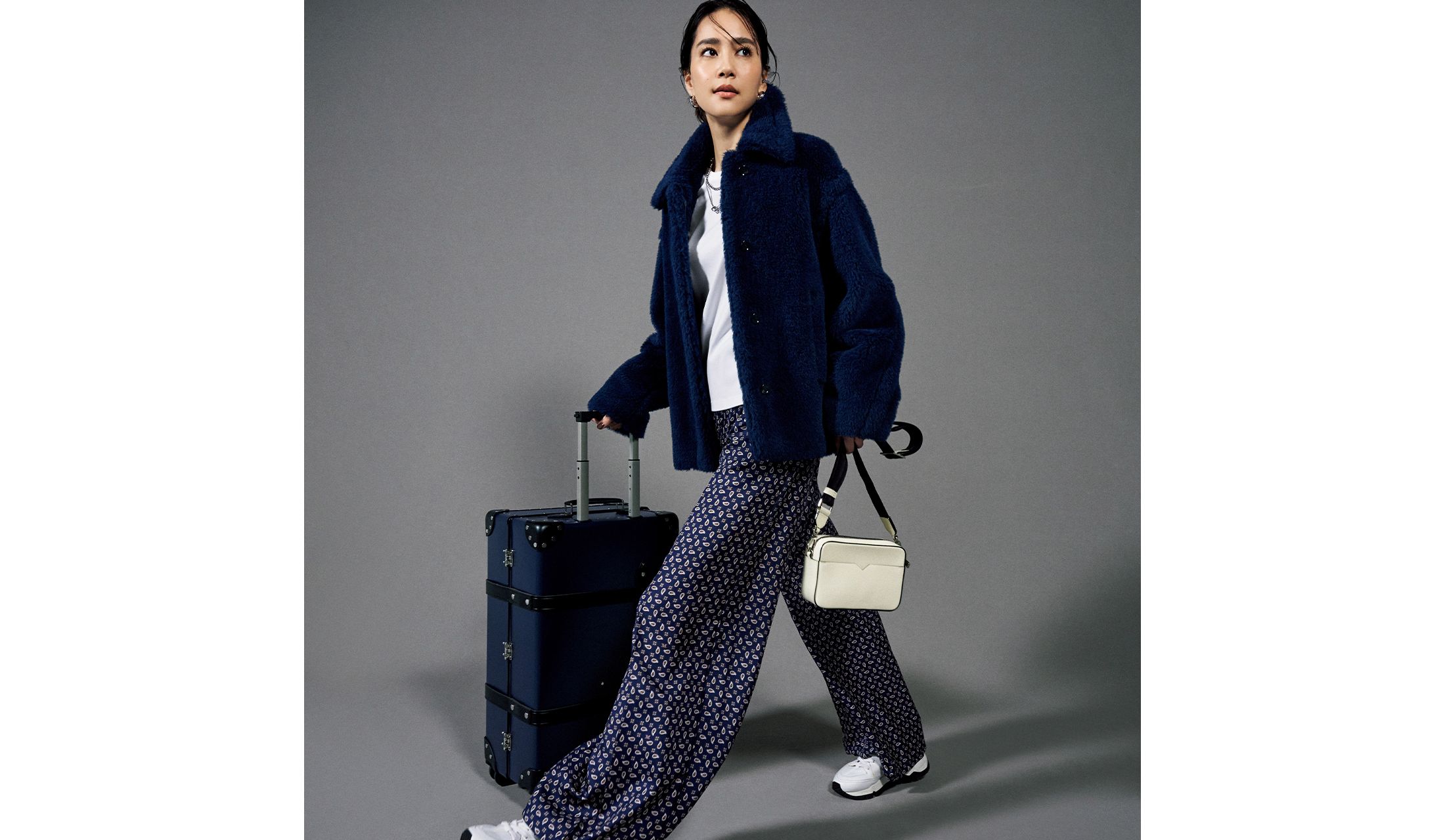 足捌きが美しいワイドレッグに、ウエストゴムではき心地がいいシルクのパジャマルックのパンツ。『テディベア』のシャツ襟ショートコートをさりげなく纏い、上質感を重ねた洗練の空港カジュアルに。