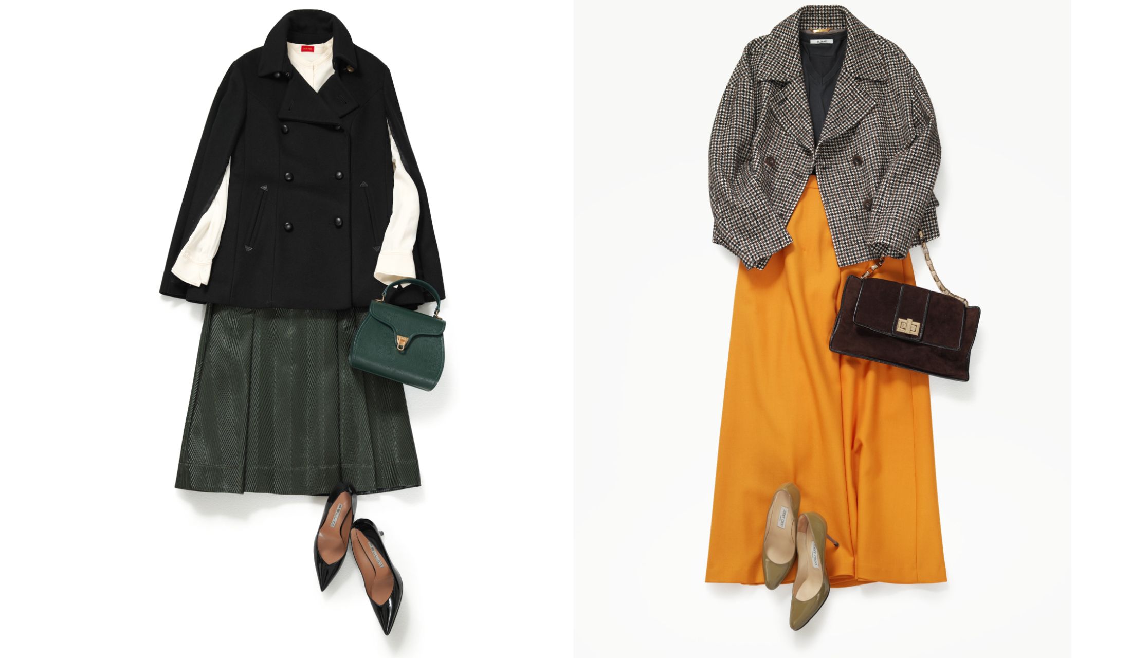 「トラッドなケープ型アウターにボクシーなスカートをスタイリング。合わせるのが普通のピーコートだと学生風になってしまいますが、ケープ型なので洒落感がアップし大人な佇まいに」(望月さん)