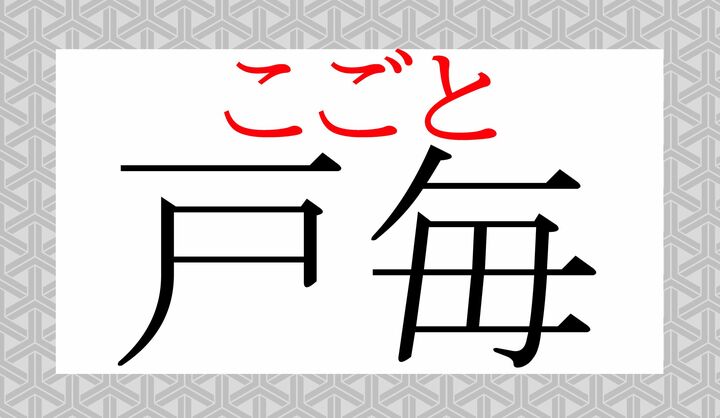 「毎戸(まいこ)」の字の順が反対になっただけですが、こちらは「戸毎(こごと)」と読みます。「部署毎(ぶしょごと)に」「クラス毎(クラスごと)に」など、「~毎(~ごと)」という言葉はよく使いますので、表外読みですが、大人の教養として覚えておくと無難です。