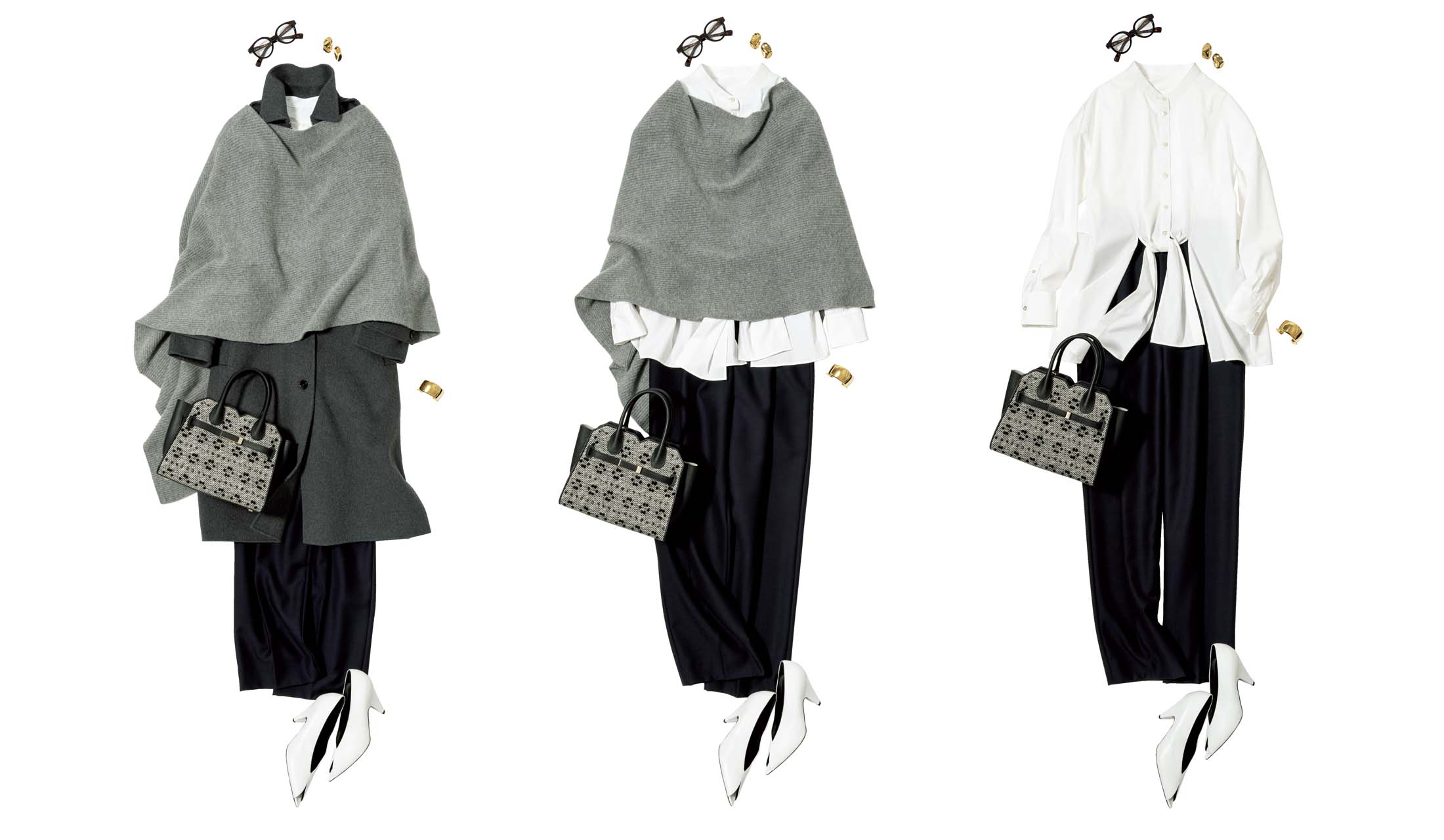 【20℃】白シャツ×黒パンツの定番ルックが新鮮に見違える、ケープニットの底力