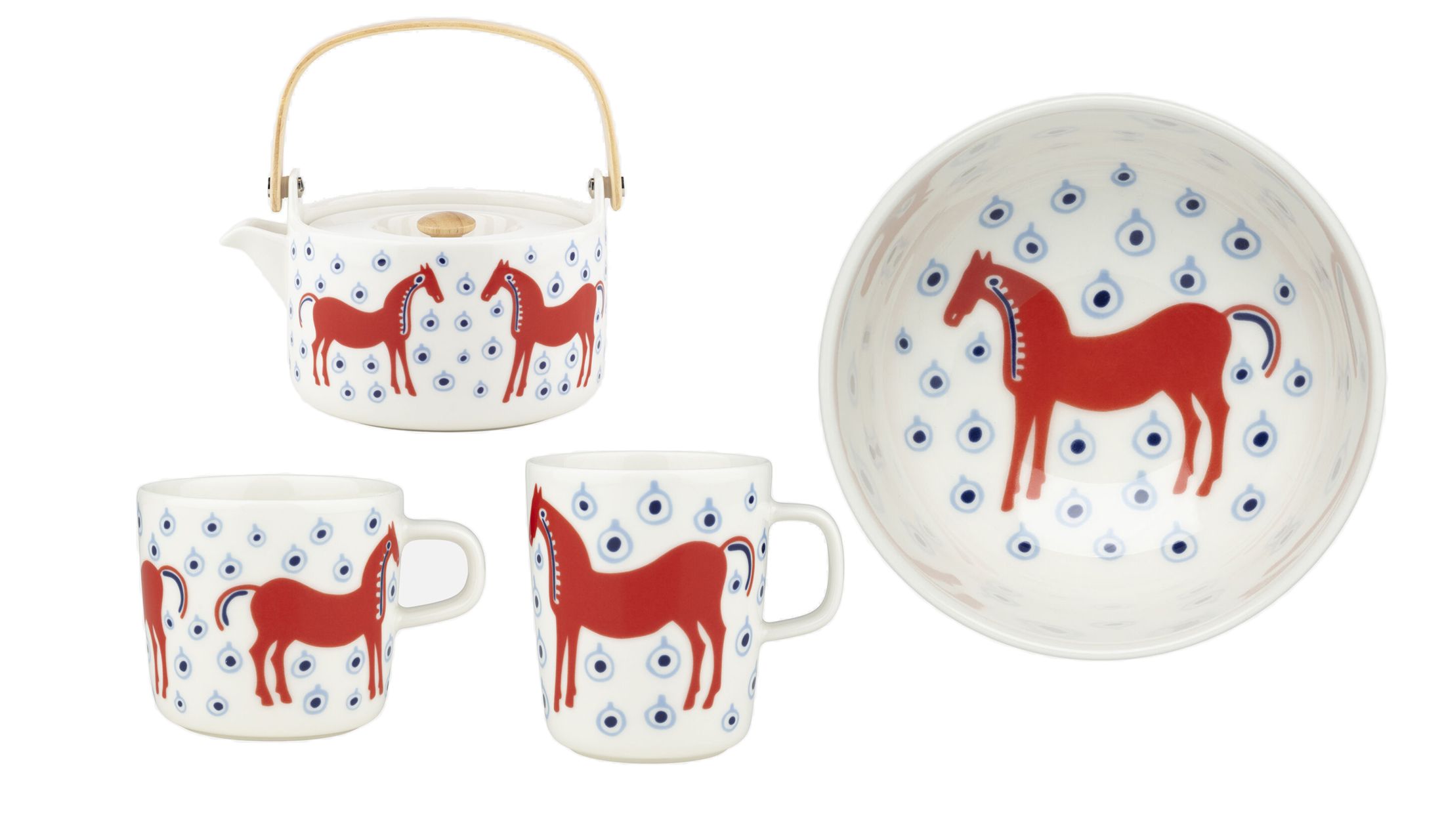 「マリメッコ」の伝説的なデザイナー、マイヤ・イソラが1954年にデザインしたアーカイブプリントを、再びフィーチャー。馬の群れと共に森を駆け抜ける自身の姿を思い描いたという、幼少期の記憶に着想を得た作品がカップやティーポット、ボウルをポップに彩ります。
