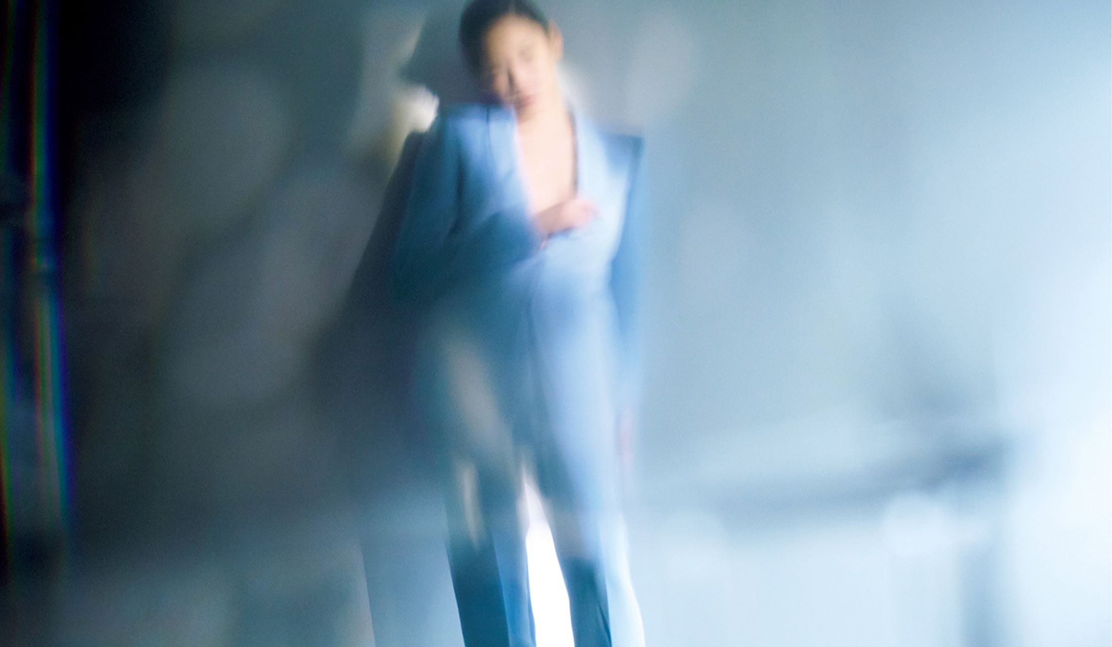 力強いショルダーラインときゅっと絞られたウエストラインでマスキュリンエレガンスを描いた意志のあるジャケットを柔らかな光が包み込む。まぶたに残る印象的な情景。