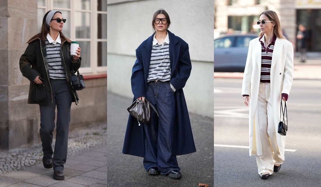 2026年1月16日、ベルリンでスナップされたデジタルクリエイターのソフィア・ガイス。チェスターコートとデニムパンツという異なるテイストのアイテムは、ネイビーで繋ぐことで一体感をもたらして。パワーショルダーとワイドパンツで量感を揃え、バランスを計算しています。重くなりがちなワイドシルエットは、ライトグレーのボーダーポロシャツを仕込むことで軽やかに更新。ボーダーはデニムパンツに自然となじみ、襟はチェスターコートにフィット。そんな中庸的なトップス選びが、コーディネートの完成度を押し上げます。