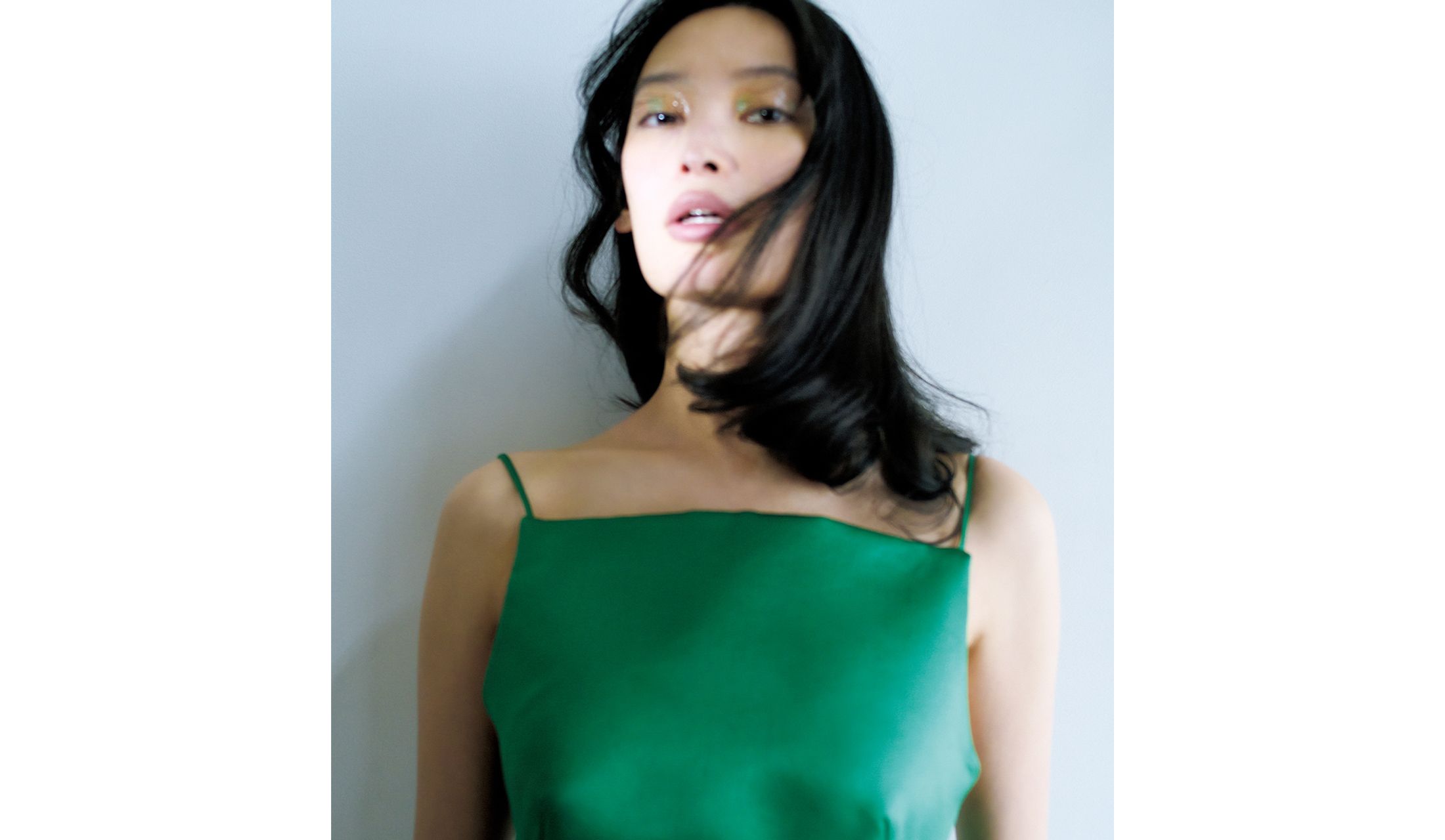 美しい言葉を発する唇と澄んだ眼差しを、メイクアップで強調して。まぶたにウォータリーな艶質感のクリアトーンとグリーンをのせて、「スライスドドレス」のビビッドなグリーンを映し出したかのようなリフレクションを表現。