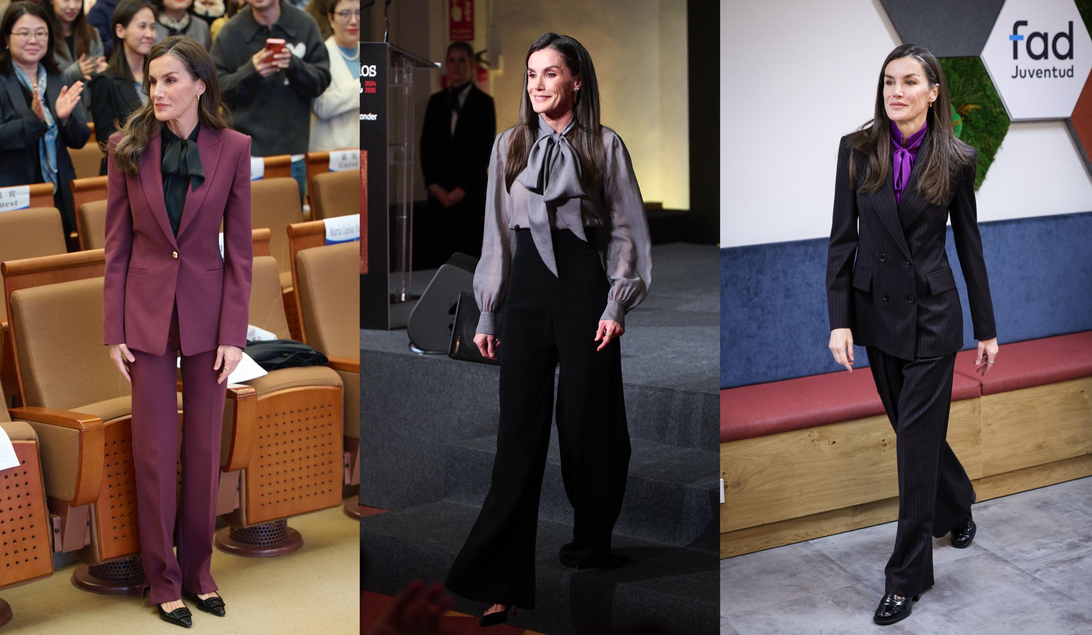 2025年11月13日、中国北京の北京外国語大学で行われたスペイン語普及イベントに出席したときのショット。バーガンディのセットアップに、黒のボウタイブラウスを合わせた着こなしです。旬の雰囲気を纏うカラーを、ブラウスの黒が小気味よく引き立てて。ボウタイがミニマルなセットアップに控えめな華やかさを添えています。足元は同じ黒のキトゥンヒールを選び、エレガンスを後押し!