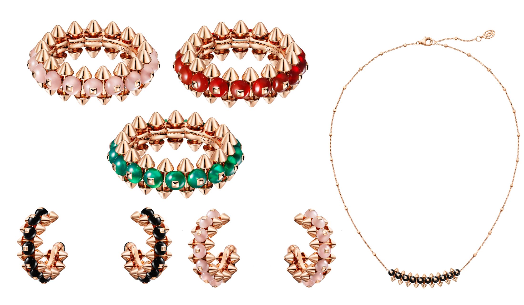 カラーストーンやオニキスを取り入れた新作。レッドやグリーン、ピンクなどのハードストーンが、コレクションに鮮やかな彩りを添えます。ピンクゴールドに挟み込まれたビーズが、リングやペンダント、イヤリングに立体感を演出。ミリ単位で厳選されたビーズは、精緻な配置によって美しい色の調和を生み出しています。