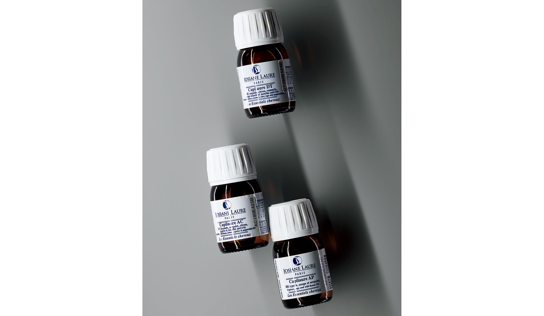 エッセンシャルオイルによる天然成分100%の頭皮美容液。『DT』(上)は毛細血管の修復、酸化ダメージを防ぐ、『AC』(中)は毛穴に詰まってしまった余分な皮脂を取り除き、『AP』(下)はフケ・かゆみ、オイリー状態をケアする。