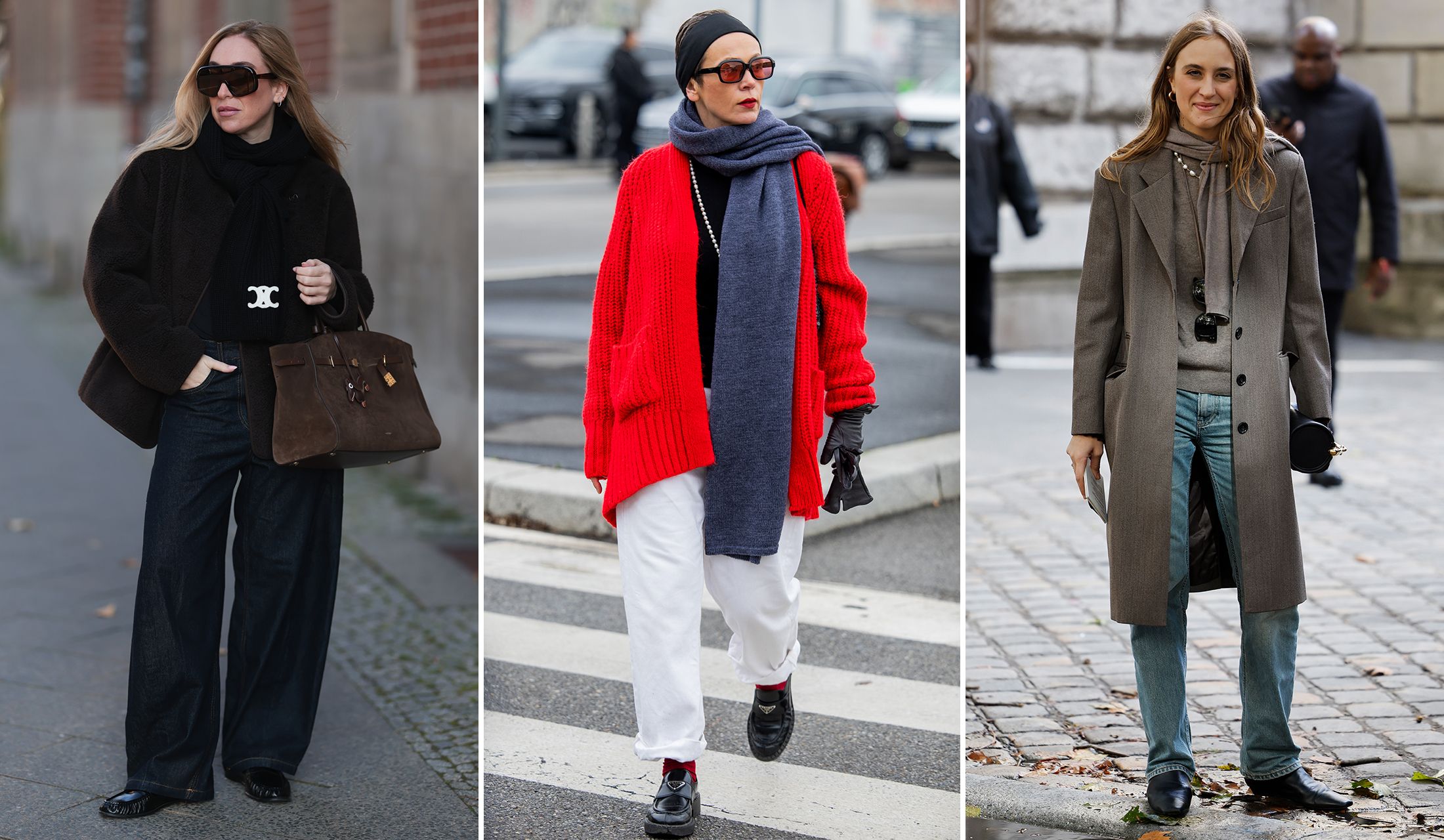 人気インフルエンサー、ソニア・ライソンはベルリンでキャッチされていました。黒いニットとデニムパンツにダークブラウンのジャケットをコーディネート。デニムも濃いめのノンウォッシュで、全身ダークカラーでまとめた装いは暗い印象になりがちに。でも胸元にニットマフラーをプラスすることで、上半身に立体感をもたらし軽快さが際立ちます。ウエスト周りにマフラーが垂れることで、体系カバーにもつながりうれしい限りです。
