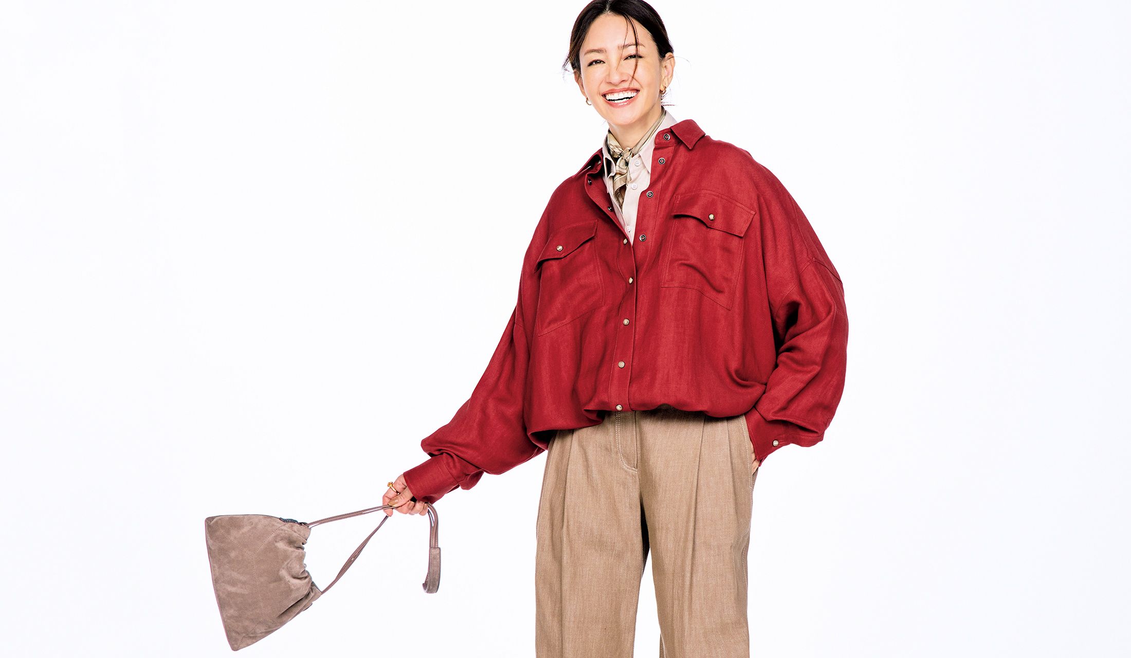 リネン混の赤のシャツジャケットは、裾がドローストリングで丈やボリュームが調整できて着こなしの幅が広がるデザイン。ワイドパンツと合わせて、今どきのシルエットに。