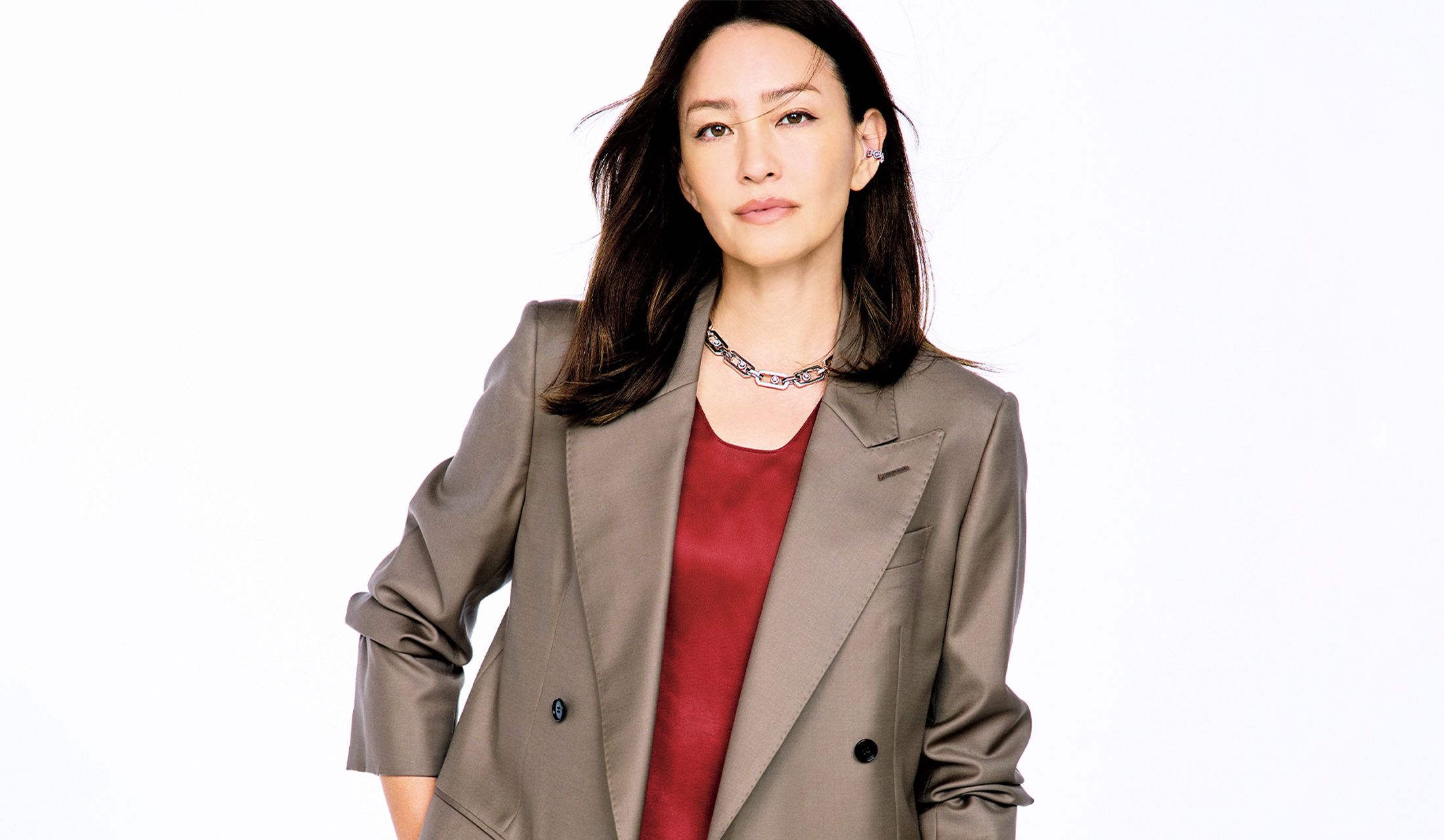 「ビネガー・ピンク」という洒落たネーミングの深く艶やかなレッドにひと目惚れ。パーティシーンでも活躍するシルキーなトップスとロングスカートのしなやかなセットアップに、青みベージュのジャケットを羽織るだけで、センスのいいNEW BOSSのオンスタイルに。