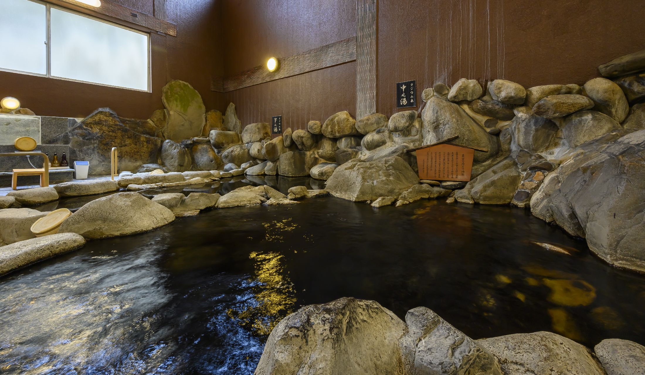「こちらの宿の名物は、足元湧出の『巌窟の湯』。足元湧出とは、源泉の真上に浴槽があり、一度も空気に触れていない生まれたての温泉が足元から湧いてくる状態のことで、湯の鮮度が抜群です。もともとは河原だった場所の源泉が湧いているところに浴室を作ったという、まさに自然のままの湯処。浴槽に入ると足元の岩の間からポコポコと気泡と共に熱い湯が湧いてくるのを、肌で直接実感することができます。