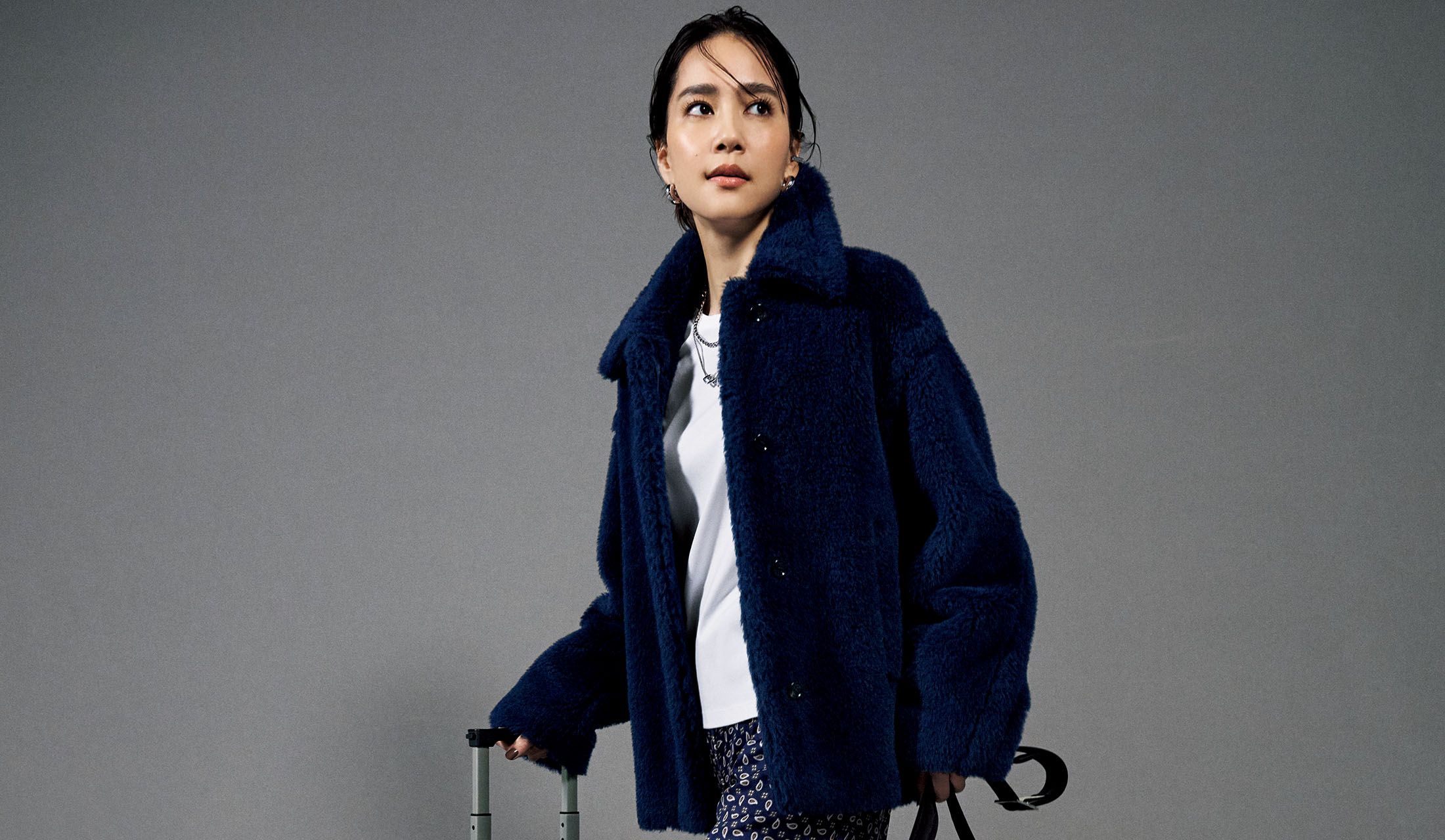 足捌きが美しいワイドレッグに、ウエストゴムではき心地がいいシルクのパジャマルックのパンツ。『テディベア』のシャツ襟ショートコートをさりげなく纏い、上質感を重ねた洗練の空港カジュアルに。