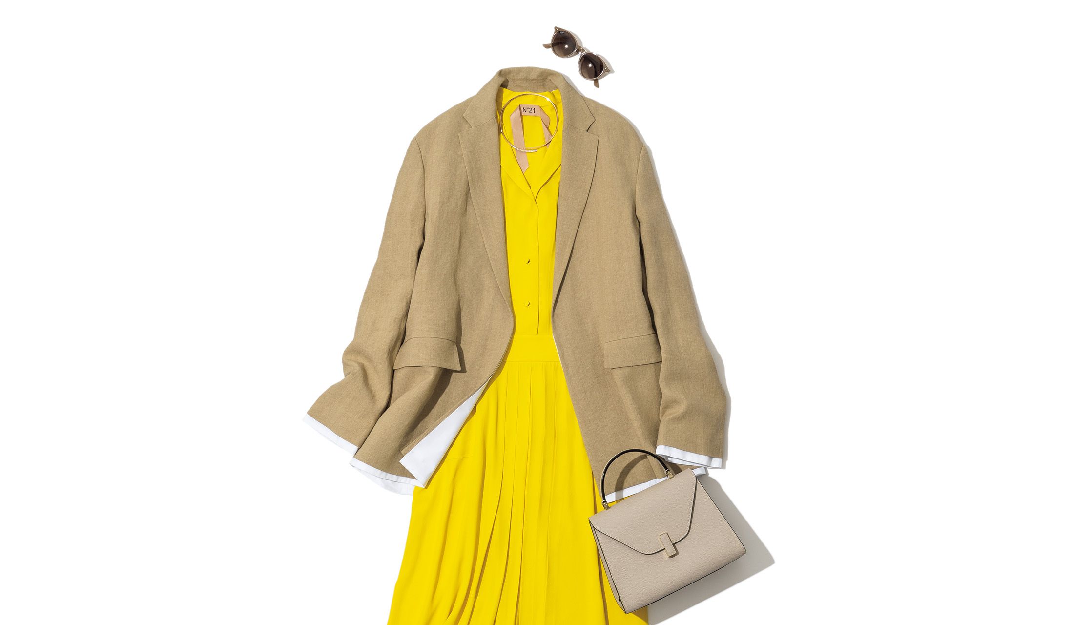 サフランを思わせるこっくりとしたイエローのワンピースを主役に、いち早く春を纏う。