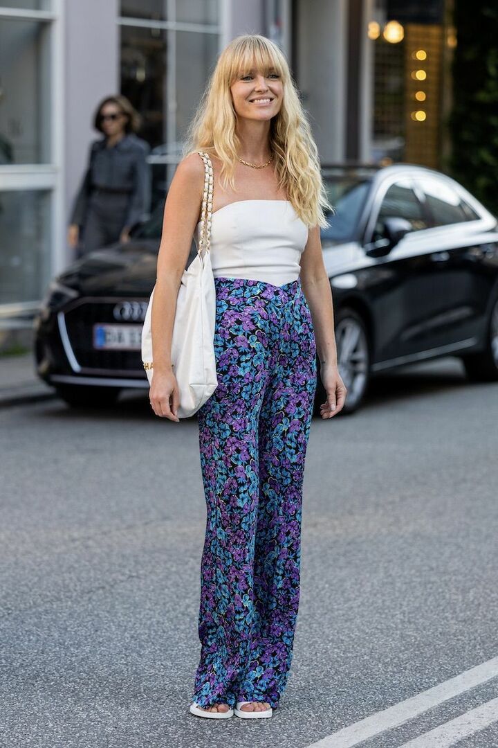 ブルー×パープルの大胆な花柄パンツを主役に。V字を描くハイライズで縦ラインを強調し、スタイルをシャープに強化。トップスには潔い白のベアトップを指名し、ミニマルに引き算。
