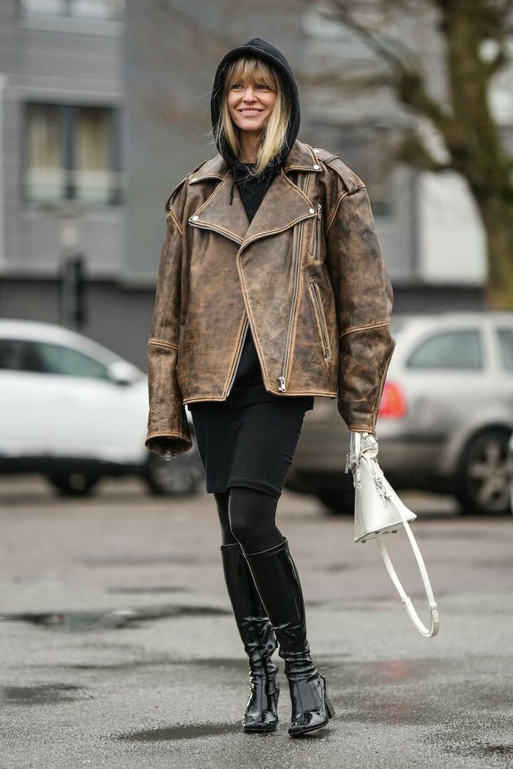 カジュアルなパーカ、ストイックなレザージャケット、レディなタイトミドルスカートのミックススタイル。緩急のあるシルエットで構築ラインを生み出し、モードを極めて。