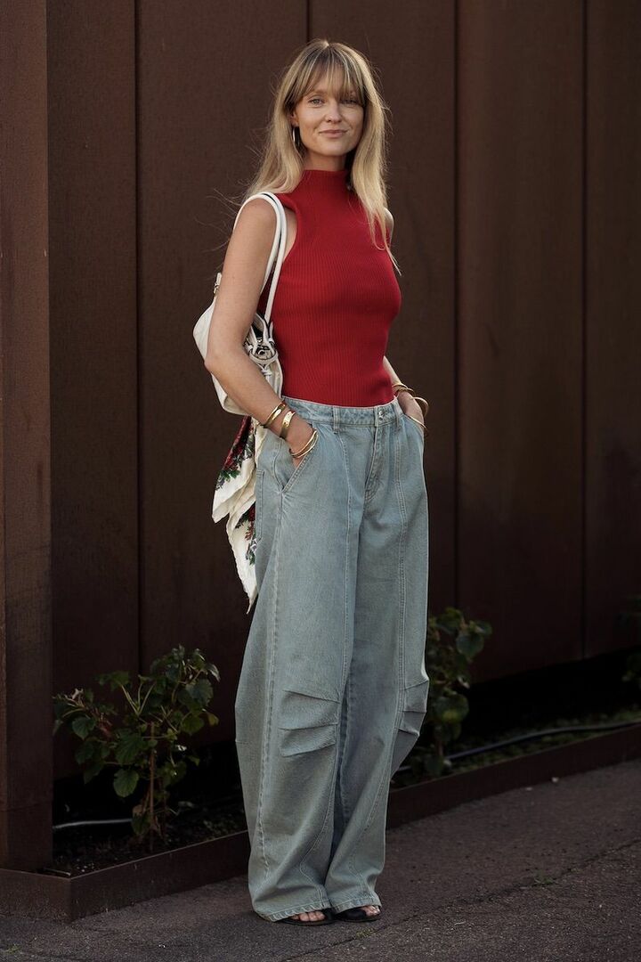 ワイドデニムパンツとフィット感のあるノースリーブトップスで、しなやかなシルエットを形成。鮮やかな赤と淡いブルーの配色が、遠目にもキレイ。白のバッグに揺れるスカーフをプラスし、爽やかな余韻を持たせて。