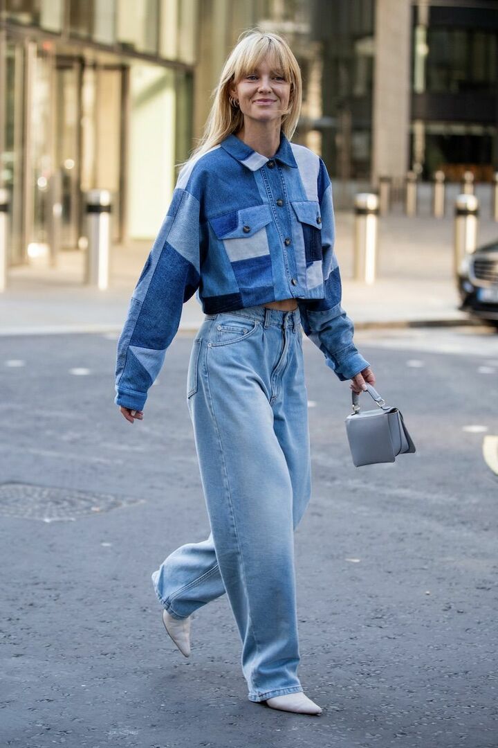 デニムONデニムのカジュアルスタイルも、印象的なデザインのショート丈ジャケットとワイドパンツでメリハリを構築。お腹のチラ見せと白のポインテッドトゥパンプスで、フェミニンを添えて。