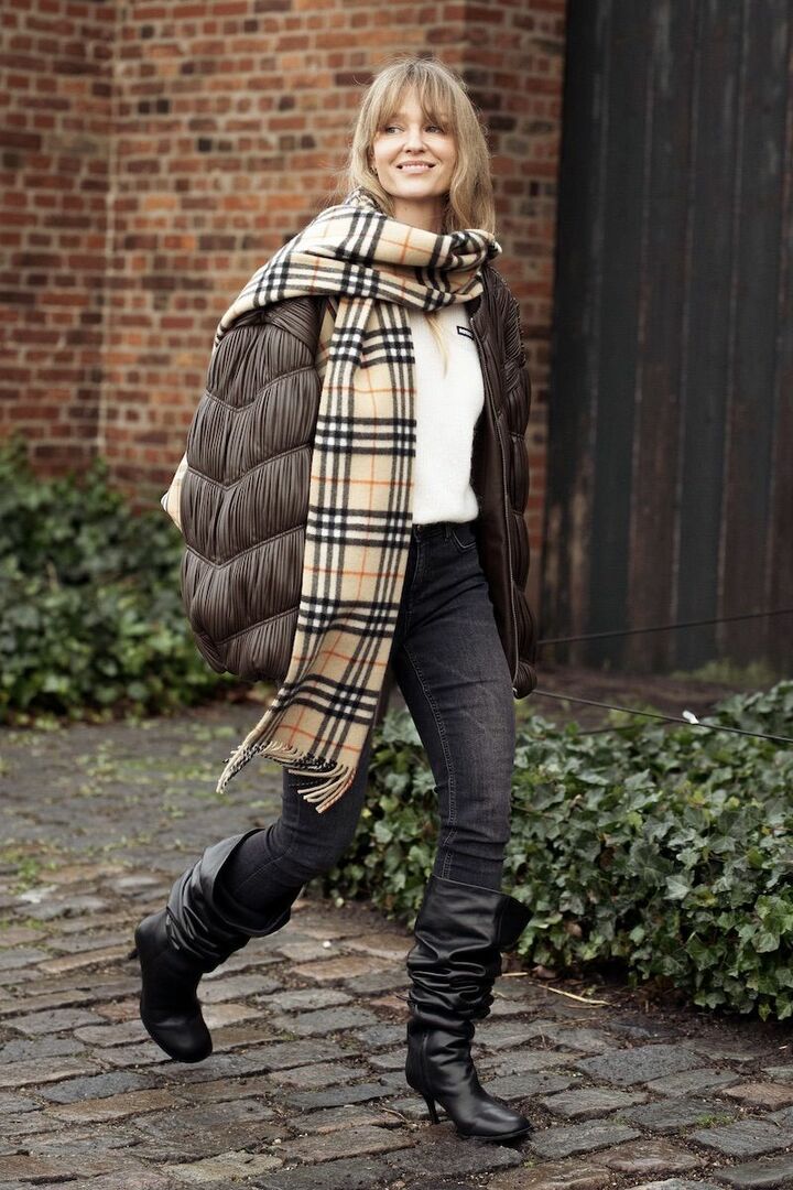 懐かしさ感じるタイトなスキニーデニムも、構築的なボリュームブルゾンと存在感のあるブーツを掛け合わせれば、今どきの印象に。チェックストールが視線を縦に流してくれるから、スタイルアップにもひと役。
