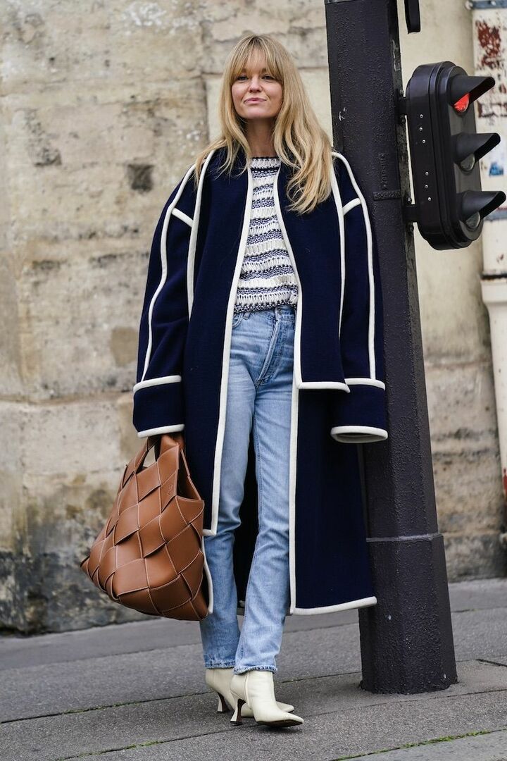 コートの直線的なパイピングでスタイリッシュさをまといながら、白ブーツと丸みのあるバッグで柔らかさをプラス。ボーダーがさらなるリズムを生み、フェミニンとシャープさが心地よく溶け合って。