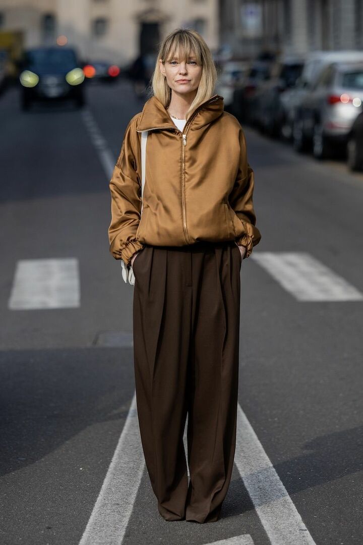ジップアップブルゾンとタックパンツのハンサムカジュアルは、キャメルとブラウンのニュートラルカラーに任せて大人らしく。微光沢感のあるアウターがさりげない華やかさを添えてくれます。