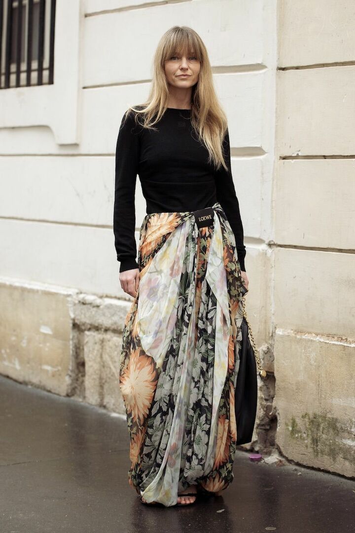ドラマティックなフローラルプリントのボトムは、一見スカートのように見えるパンツ。モードフェミニンなアイテムを支えるのは、ミニマルなブラックトップス。