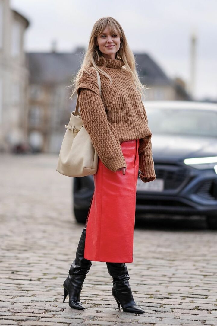 鮮やかな赤のタイトスカートと黒のスラウチーブーツをレザーでリンクしたボトムコーデは、親しみやすいキャメルニットで強さを和らげて。異なるテイストを繋ぐのは、中庸的存在のエクリュバッグ。