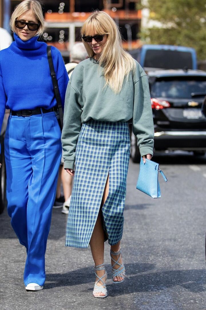 チェック柄スカート×ヒールサンダルのフェミニンな組み合わせは、スウェットプルオーバーで肩の力を抜いて。タイトシルエットと深めスリットがキレを添え、甘さをほどよく制御。くすみトーンにも、糖度を和らげる作用が。